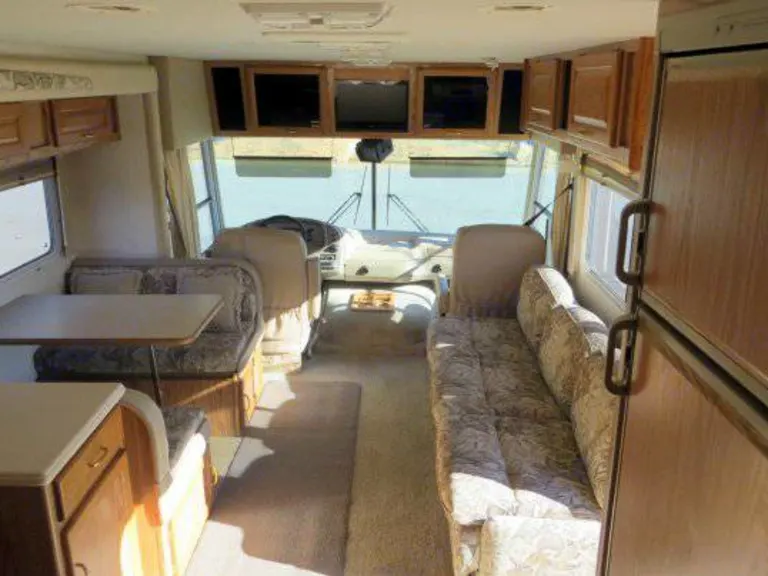 Ready to go!! This 31 ft Class A motorhome coach is a convenient way to go camping with all the amenities, and still under 20k miles on it! Two slide outs, for an extra spacious living area, queen bed (with very comfortable cooling gel mattress) in the rear of the coach, pullout sofa sleeper up front, and a dinette table that folds into another bed - great for smaller kids (or separating 2!). Comfortable to drive, and quick to setup once parked, with push-button hydraulic levelers, a 5000kw generator, (2) LCD flat screen TV's, both with DVR players w/ remotes, 1 in front room and also 1 in the back bedroom. Microwave / convection oven / stove, and 30/50 amp service. 2 AC units with individual thermostats and ducted roof vents for entire coach cooling, furnace / heater with ducting, shower and private bathroom. Hot water, shower, bathroom with own sink. Very comfortable coach, extremely well cared for, exterior awning pulls out for added shade outside. CD/Stereo inside as well. Additional Options: (1) camp mat, (1) collapsible camp trash can, camp chairs, (4) coffee cups, (4) cooking pots/pans, lots of free under-storage, and plenty of cupboards, cabinets, and drawers for all your clothes, and necessities that you decide to bring with you on your trip. Bicycle rack is also available for use if you need it.