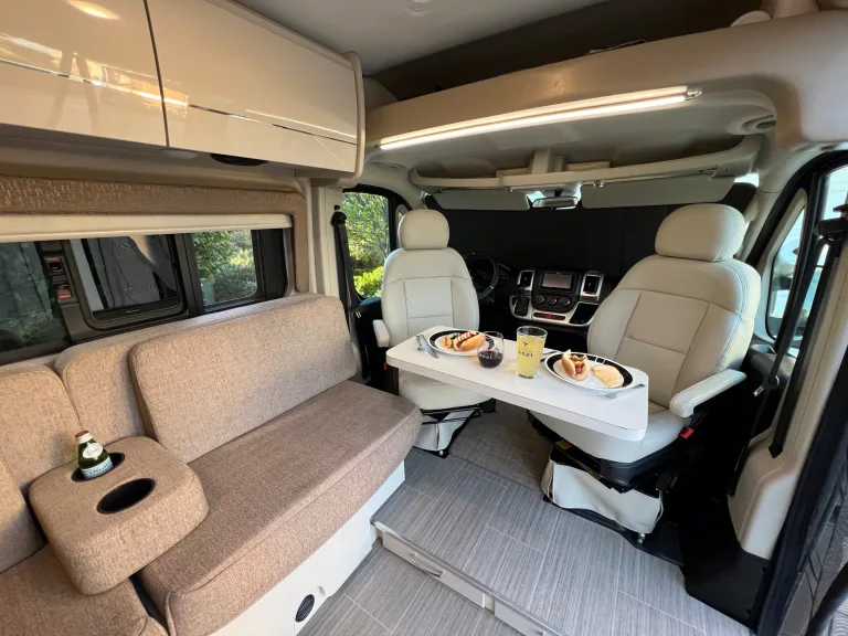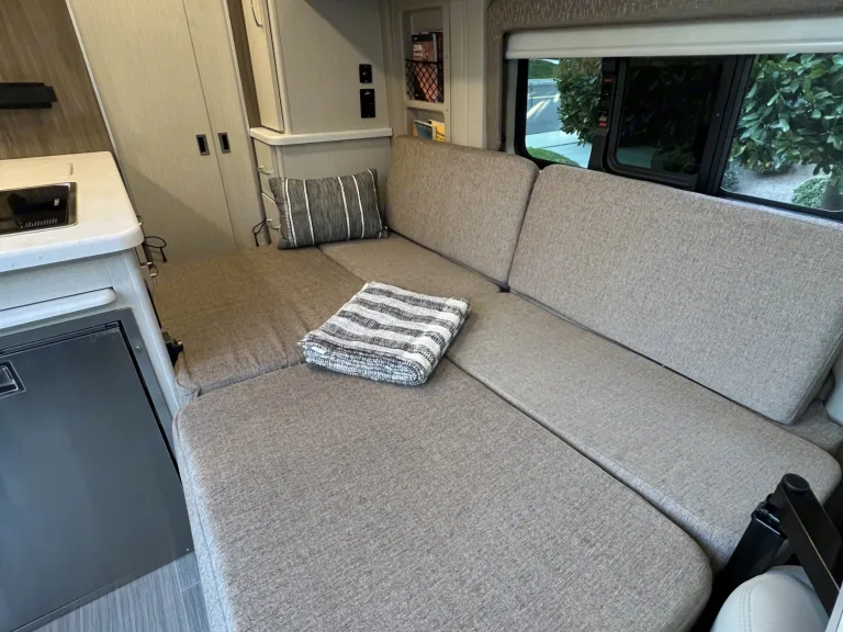 2022 Ram Promaster Thor Rize 18M with a full wet bath (shower, cassette toilet and sink). Two towels provided. Take a hot shower thanks to a 2-gallon water heater. Full kitchen with a 2-burner stove, microwave and sink. Swivel captain seats and comfortable couch that pulls out into bed for two. Lagoon table for meals, work or games. Spacious fridge with freezer box. Dog-friendly with built-in food and water dishes. Power awning and exterior LED lighting. 30-amp power connection and water hose for city water connection or gravity tank fill. Two-bike rack.What's includedTowels for two