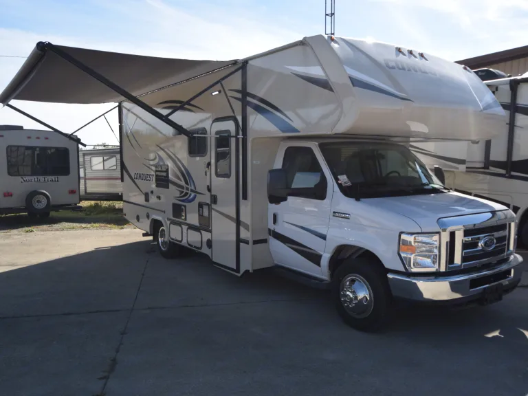 Conquest Luxury Package: 4.0 Onan Generator - Enclosed | Electric Awning with LED Lights & Speakers | 13,500 BTU Roof Air Conditioner | AM/FM/CD Radio with Built in Monitor/ Back Up Camera | All Stainless Steel Appliance Package | High Gloss White Fiberglass Ext Sidewalls with Azdel | Upgraded LED Lighting Interior & Exterior | Exterior Acrylic Grab Handle | Range Cover | Friction Hinge Entry Door with Shade | Upgraded Designer Graphics | Ducted Roof Air Conditioner | Ceiling Light Wall Switch at Entry Door | Linoleum Throughout | IRD Dual Battery Charging System | Emergency Start Switch | Deluxe Comfort Mattress