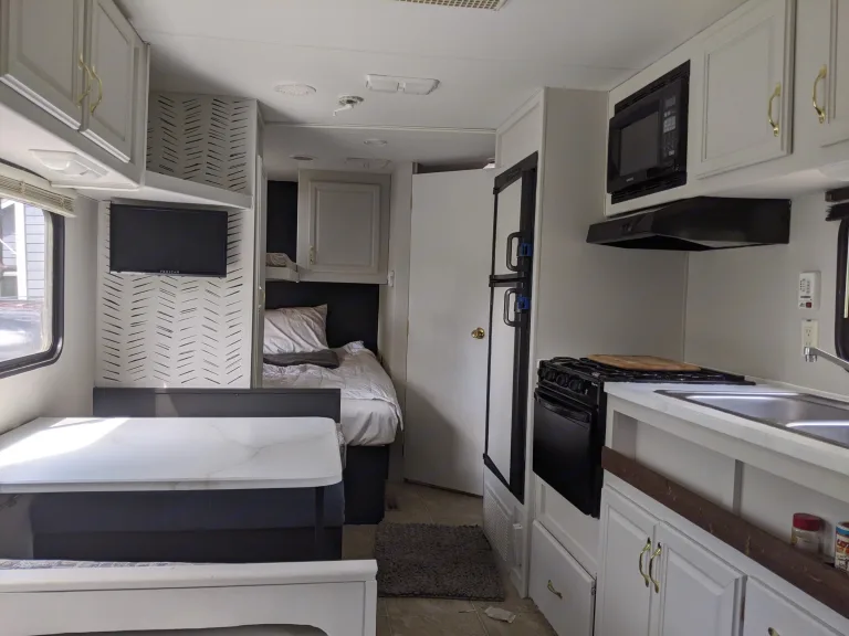 Bring your overnight bag and enjoy! This trailer is simple to set up. No slideouts or fold down bunks. General cooking and camping supplies included. Interior has been decorated in a fun modern style that gives the space an open and airy feel.