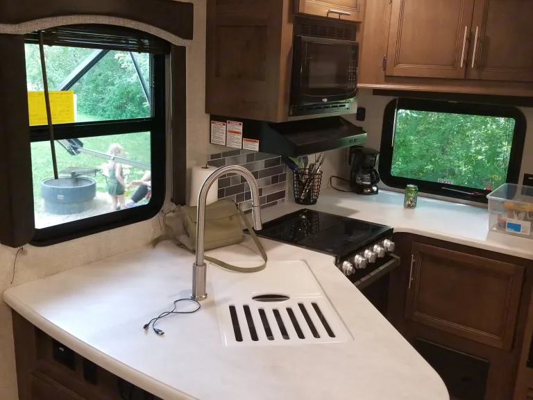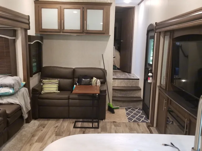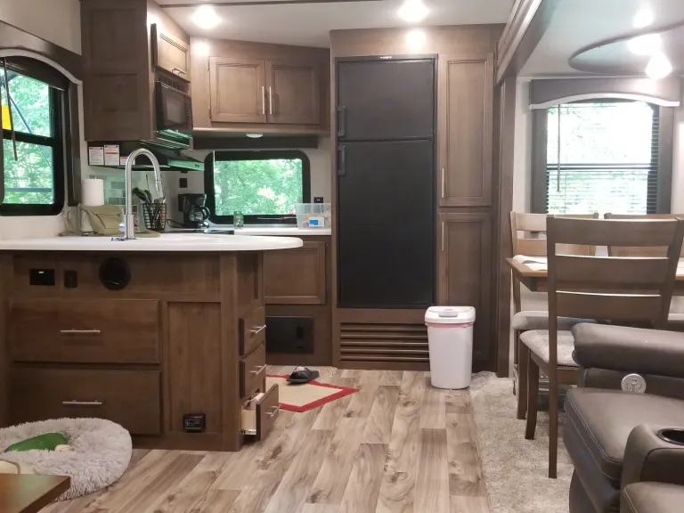 It's a rear kitchen setup. Opposing slide outs in the main room make it feel huge. 2 recliners with heat and massage, large screen tv, electric fireplace. One slideout in the bedroom. Outdoor kitchen with fridge and grill. The couch folds down into a bed that would be tight for two adults but works great for an adult and child. It's an easy tow and comes with tire pressure monitor.