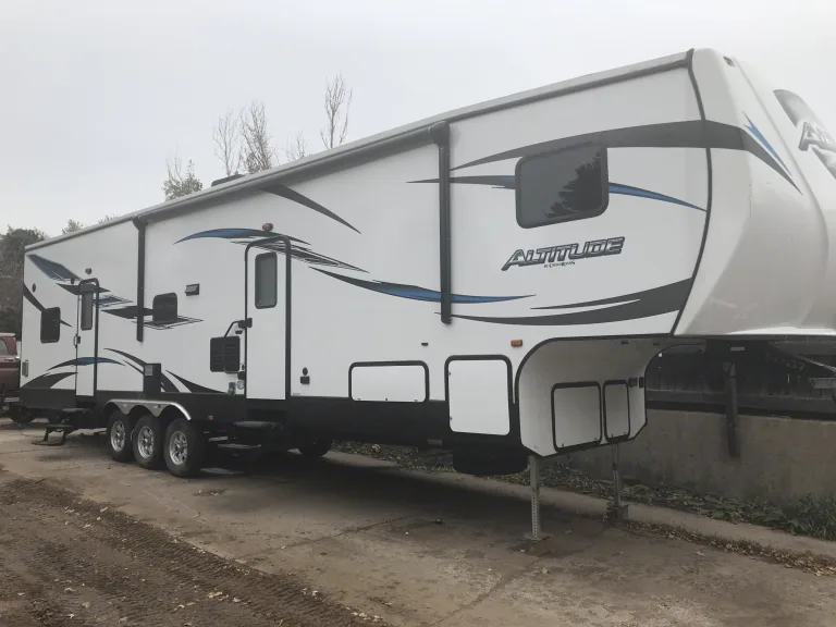 This toyhauler fifth wheel sleeps 8 comfortably. It has 2 bathrooms, a fueling station, huge water tanks, and tons of storage!