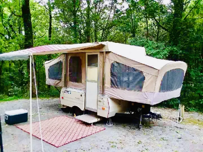 Camper is stationary at its scenic location at Country Cottage Rentals. This location is great for those whom love to fish, hike or enjoy boating. Situated only three miles from beautiful Edgar Evins State Park, Center Hill Lake and nearby marinas. This 1987 Coleman Pop up Camper sleeps up to 6. Two full size fold out bed spaces with dinette table with benches for which fold out to another sleeping space just right for children. Comes with sink, stove , microwave and coffee machine. . Also has heating unit, cooling fan and can be connected to electricity. Does not have bathroom but campers have use of Country Cottage Bathroom facility.