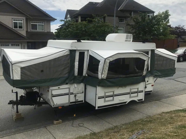 Clean and spacious tent trailer with one slide out. Sleeps 8 but I would say 6 end is a king size and the other is a queen. These mattresses come with mattress heaters but you must have 120v service. The couch turns into a bed as well as the table. Electric crank to open trailer. Has a 3 way fridge, 3 burner stove, hot water, and sink. A/C on 120v 30 amp only.Outside shower 1 propane tank and two fully charged batteries. Smoke and gas detectors are hooked up inside of trailer. Spare tire, jack and tire wrench. This a large trailer weighing close to 2500 lbs dry so will most likely need a truck to tow it. Tons of storage, roof racks for your small fishing boat, canoe or kayak. Hanging closets for your convenience. We provide a tarp, ropes and pegs for bad weather as we ask that you use it to cover the canvas during rainy times.