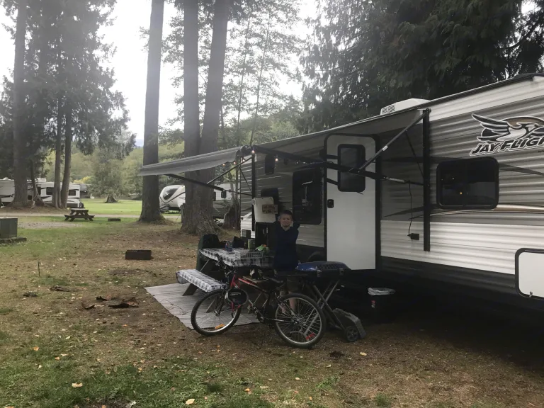 Perfect for a small family of 3-5 people. 26’ Trailer with 2 Double size bunks, Dinette into bed + Queen size bed up front. Dinette seats 4. Comfy leather couch turns into a bed. Lots of storage. Great size fridge/freezer - operated by Electric or Propane. Bathroom has a tub/shower. Fully loaded with all the camping gear you would need: Dishes,utensils, pots and pans, Coleman BBQ, 4 camping chairs. Just bring your bed linens and towels. Towable with F150/Ram 1500 or similar size truck. Equalizer Hitch included. Prefer if trailer is used in campgrounds with full hookup (Power, Water and Sewer) - Delivery available for drop off and pick up on Wednesdays, Fridays, Saturdays and Sundays Only.