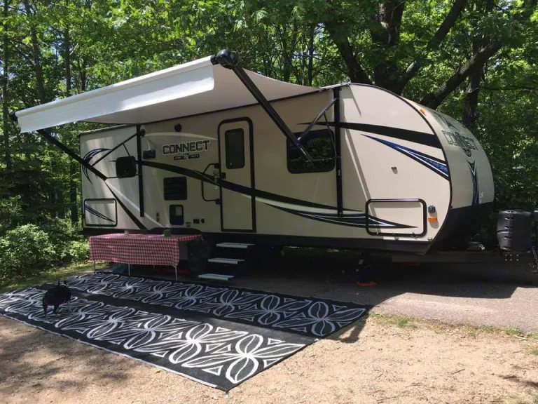 A spacious couple's camper, easy to tow with all the amenities of home. Private bedroom (queen bed) with direct bathroom access. This camper also has a couch and table that fold into beds for children or smaller adults, and comfortably sleeps 4. The deep slide provides ample room to stretch out, with a large living area and lots of counter space. A 42" flat screen with digital signal antennae booster, and dvd player, provide entertainment for those rainy days. The full bath has a roomy corner shower, with glass door and skylight. The 6 gallon water heater (gas/electric) provides plenty of hot water for those camping shower needs. The outdoor kitchen with 2 burner stove and apartment fridge makes cooking outside a breeze. Included in the rental is a backup/observation camera on the rear of the camper, with a small suction cup mounted viewing monitor for the tow vehicle.What's includedCamper will include basic set of dishes, cutlery, and cookware for 4 people. Large outdoor rug (8x20) and two(2) zero gravity style chairs, as well as 2 bag style folding camp chairs. Bed linens for the queen bed are included, and a hand towel for each sink. Please provide your own bath towels and any bedding needed for the couch or table if used for sleeping.Other things to noteRenter is expected to provide their own bath towels. Please make sure to sweep the floors and shake out rugs before return.