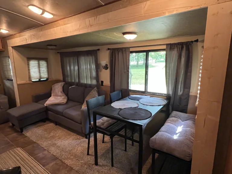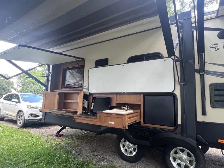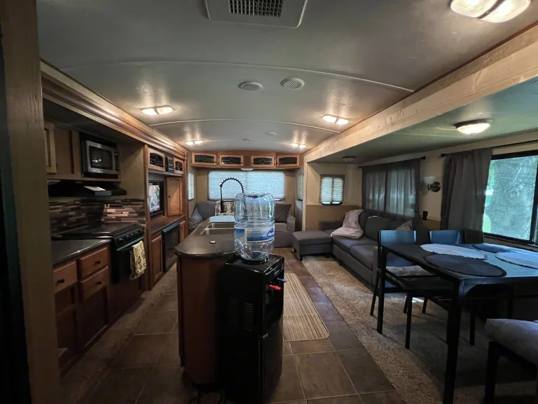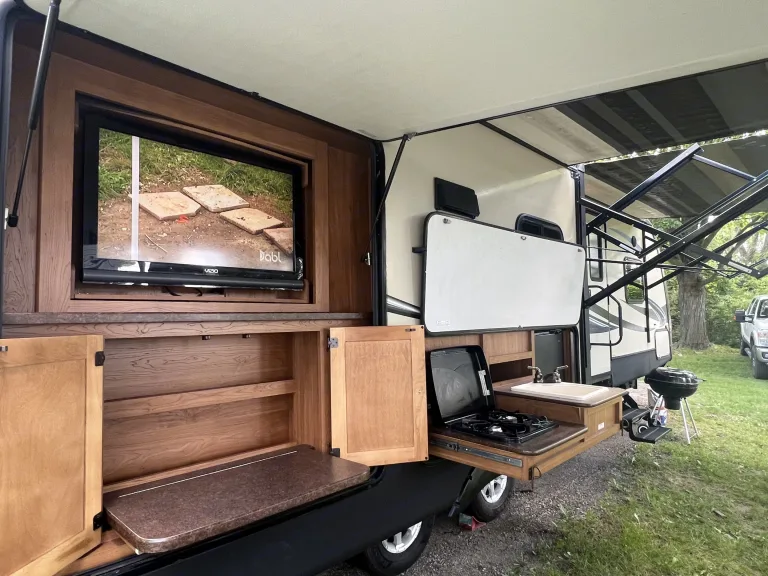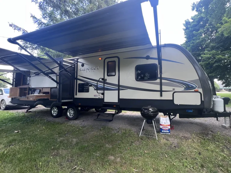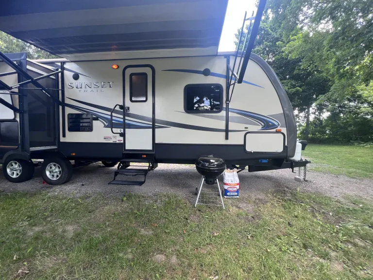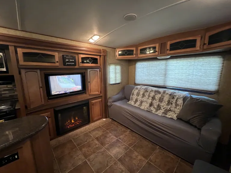 . 36’ ft sunset trail, sleeps 5, up to 7 with air mattress, with 3 slides, two TVs, fireplace (with heat), two awnings, shower, kitchen island, indoor/outdoor speakers, outdoor kitchen, TV swivels around outside for campfire movie nights, dishes, plates, cups, pot and pan, utensils will be included, along with linens for master bedroom. Cold water dispenser is available for $15, which includes 8 gallons of water. Dispenser has hot and cold option. Charcoal and charcoal grill also optional for an additional $20. Includes full bag of charcoal, along with grilling utensils. NO Smoking please. We ask that you please return the camper the way received. No festivals. Security deposit is required. **Delivery Only $3 per mile up to 100 miles, $4 per mile every mile after 100** What's included36’ ft sunset trail, sleeps 5, up to 7 with air mattress, with 3 slides, two TVs, fireplace (with heat), two awnings, shower, kitchen island, indoor/outdoor speakers, outdoor kitchen, TV swivels around outside for campfire movie nights, dishes, plates, cups, pot and pan, utensils will be included, along with linens for master bedroom. Cold water dispenser is available for $15, which includes 8 gallons of water. Dispenser has hot and cold option. Charcoal and charcoal grill also optional for an additional $20. Includes full bag of charcoal, along with grilling utensils. NO SMOKING please. We ask that you please return the camper the way received. No festivals. Security deposit is required. **Delivery ONLY $3 per mile up to 100 miles, $4 per mile every mile after 100** Other things to notePlease No smoking, no festivals, we ask the trailer is returned the way you received it. Please leave any wet/dirty towels in the shower before vacating.