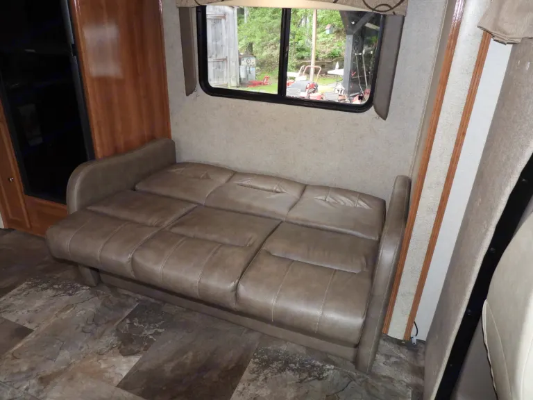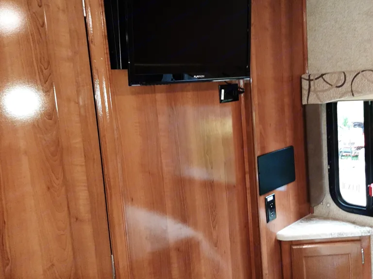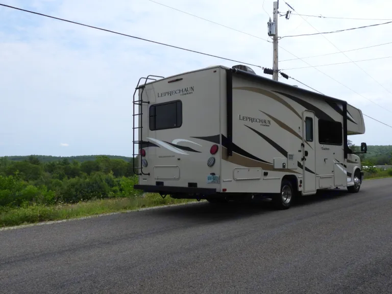 This Coachman Leprechaun is 28 feet long with 2 slide outs. It sleeps 6 adults but would hold 2 additional children. Full queen bed in the rear, over-cab double wide bunk, kitchenette conversion double bed and a sofa that jack knives to a bed. Beautiful cabinetry in a fully equipped kitchen. It has a full bath with spacious shower. Two interior TV's with DVD on main TV. Outdoor TV, stereo and pull out work table.