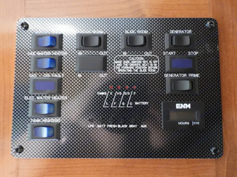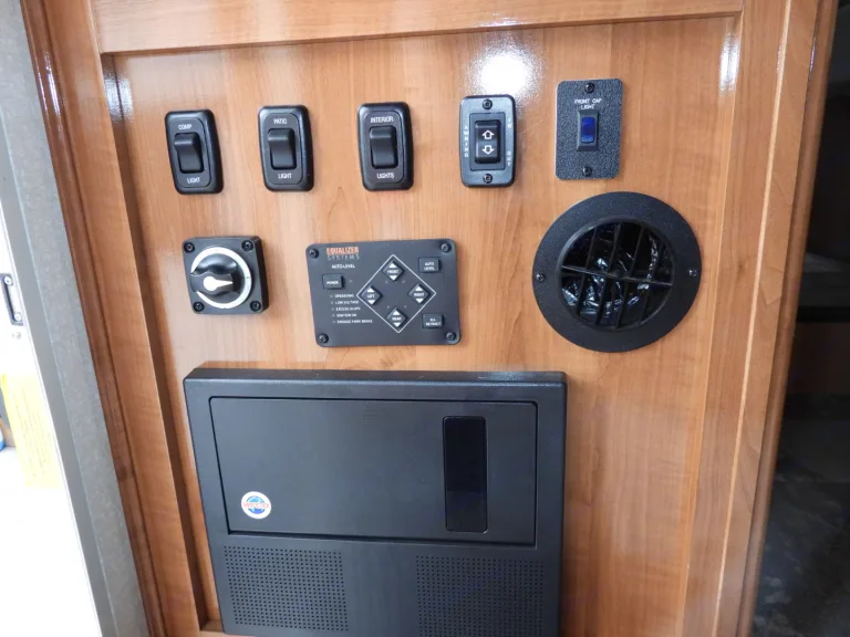 Large automatic canopy with lights. Automatic self levelers. Plenty of outside storage for all your camping needs.