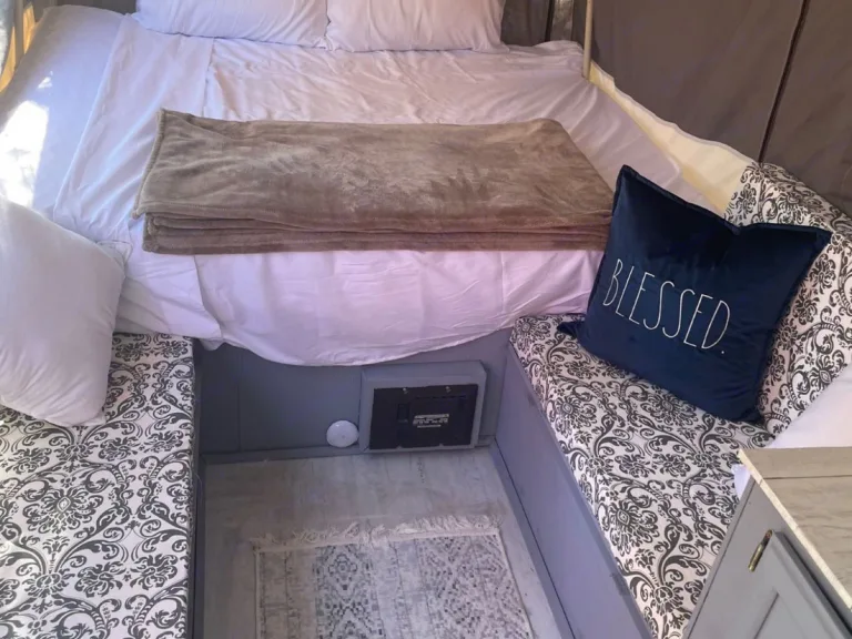 Newly renovated completely on the inside new paint, bedding, storage, and new canvas. Has two queen beds on the inside that pull out, ample sitting space inside for 4 ppl with table very clean feels like home. Towable with any car weight only 975(LBS). Music festival and event friendly What's includedFresh linens, Blanket, Pillows