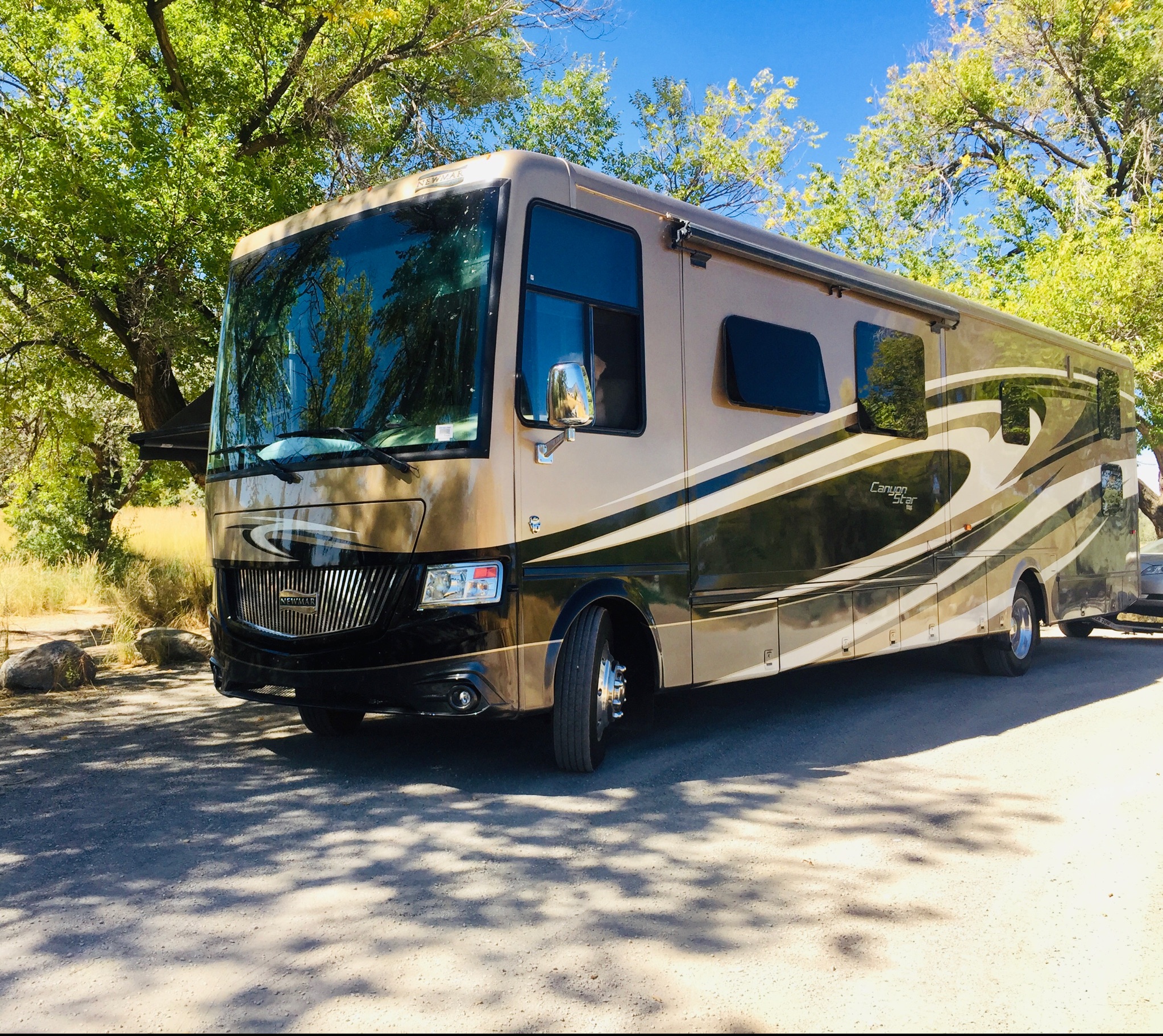 The outside of this coach has a 32” flat screen TV and surround sound which includes outdoor speakers and cd/mp3 player. It also has an outdoor shower and a separate unleaded fuel station for your toys. This coach has 2 separate slide outs. It is also equipped with auto motion power sun shades, daytime use shades and black out night shades and central vacuum system for quick clean ups. The side view cameras and rear back up cameras are helpful. There is an auto level system. Making it perfect for fall/winter and holiday weekend trips. 50 amp Rv hook ups recommended for this large unit when booking Rv parks. Rv experience is highly recommended when renting this unit for driving and use.