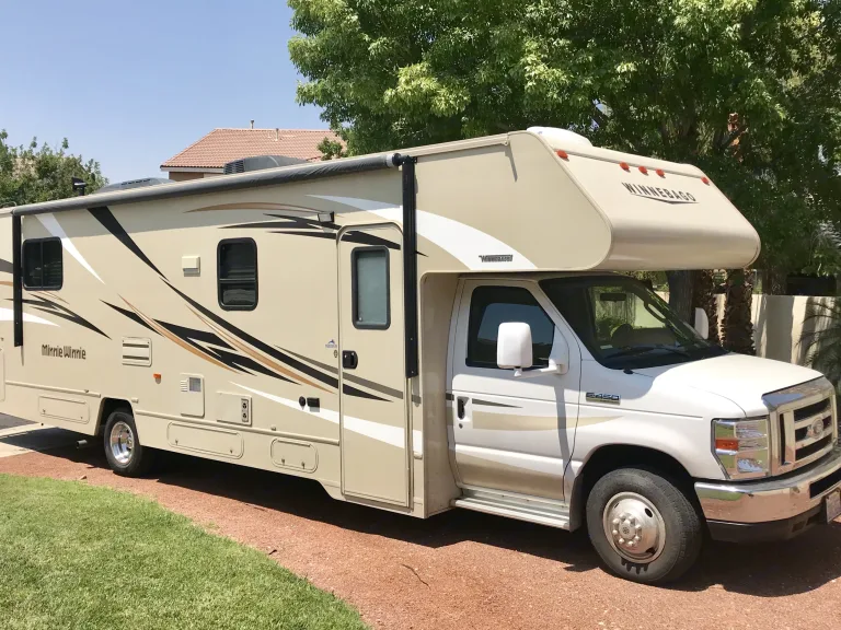 31’ Winnebago Minnie Winnie with large 15’ slide. U shaped eating area seats 5 adults comfortably. King sized loft above the driver sleeps 2-3 adults or 4 kids. Open kitchen area with lots of counter space. Master suite in the back with a comfortable memory foam queen bed. Ford F450 chases with a V10 and the upgraded transmission for smooth shifting and easy towing. Tons of storage space down below.