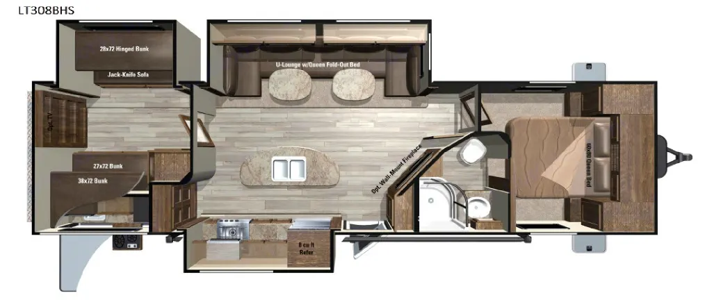 3-slides, rear bunkhouse, indoor/outdoor kitchen, refrigerator, 3-burner range, microwave, large slide out w/U-shaped lounge, queen bed, overhead storage, two dining tables. Bath has shower, toilet, sink. Front bedroom queen bed, w/storage. Rear sofa, 3-bunks, storage.
