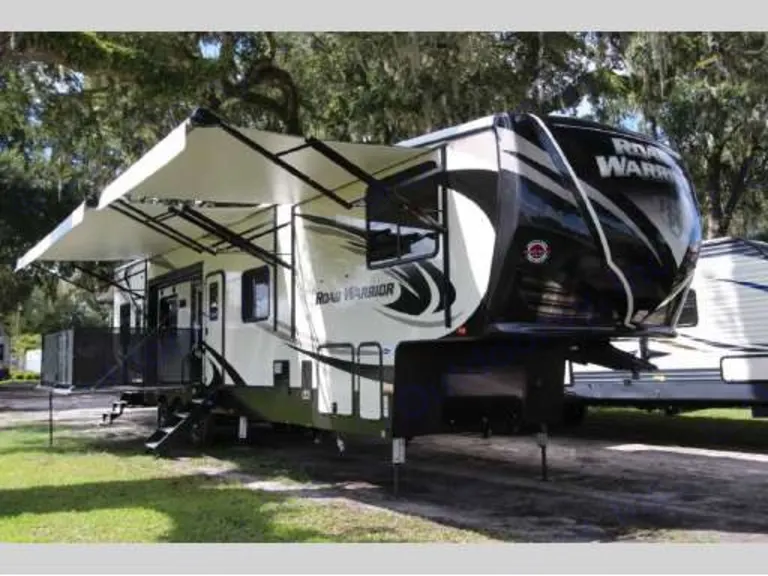 When you are ready for your next vacation to include time outdoors riding the trails and then coming back to the comfort of your home away from home, you will want this double slide out Road Warrior 427 toy hauler! The 12.5' garage has enough room for a few dirt bikes or even an ATV. With the half bathroom in the garage, you can easily clean up before heading inside. After dinner come to enjoy sitting outside at the patio while watching a little TV at the optional exterior 40" TV. Your kids can have their own space up in the loft, and mom and dad can enjoy the spacious master bedroom with a king bed! Whether you are taking your off-road toys to the sand dunes or to a competition, you will want a luxury Road Warrior toy hauler! These models are available with the Road Warrior Suite Package which includes items such as hardwood cabinet doors and drawers, solid surface countertops, LED lighting, plus an exterior stereo with Hdmi and two speakers. 2 king sleeping beds in the back offer additional options. The garage Will NOT FIT 4 Seat UTV'S Please look at details to see if your UTV will fit.