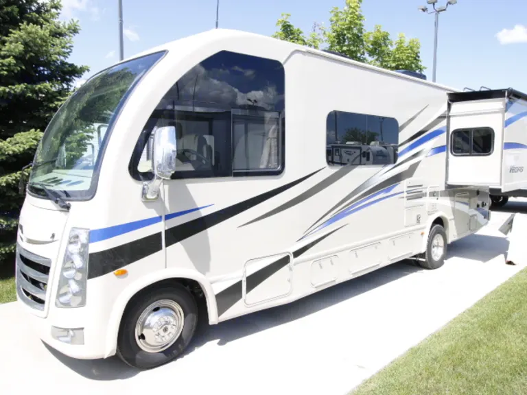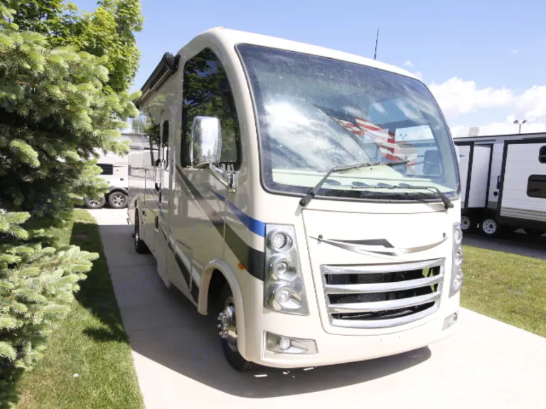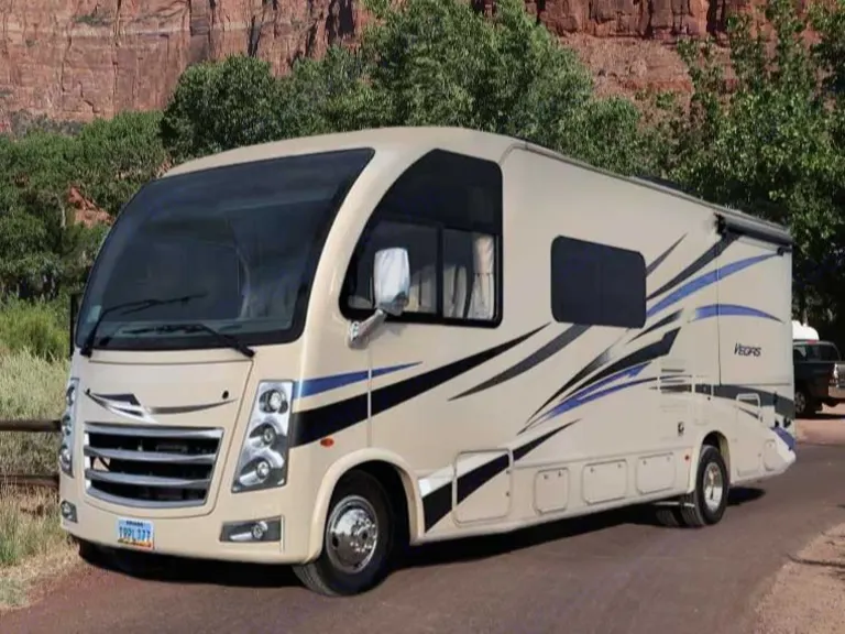 and provide all the amenities from home that make traveling so great!! From bedding to pots and pans to camping chairs and BBQ basics.We strive to provide all the necessary conveniences to make you vacation Fun and memorable.This Thor Motor Coach Vegas model 25.3 class A gas motorhome features a rear bedroom with side queen bed slide out, a rear corner bath, plus all of the amenities you need to comfortably spend time on the go.As you enter there is a 32" LED TV above the door. This can easily be viewed from the Dream Dinette that is straight ahead. The dinette features seat belts for safety while traveling, and it easily makes into a bed that measures 42" x 74" for an extra guest.To the left of the entry door find a kitchen where you can conveniently prepare and cook meals. There is a round sink, a counter space along with a flip up counter-top extension, a pull-out pantry, and two burner range with microwave/convection oven. There are also plenty of overhead cabinets and lower cupboards and drawers for dishes and things. The refrigerator is on the opposite side beside the Dream Dinette.Slide open the doors to enter the private rear bedroom. Here you will find plenty of closet space in the two closets that are opposite one another. Enjoy a great night's rest on the queen bed slide which is along the road side wall. A 32" LED TV is on the opposite wall for easy viewing from bed.A rear private corner bathroom includes a shower, a toilet, sink, and overhead cabinets. You will love the convenience of your own on board bath!If you need an additional sleeping space, the drop-down overhead bunk above the cab provides a 38" x 73" sleeping space for an added guest.Outside you can watch your favorite television show while enjoying the great outdoors, plus so much more!