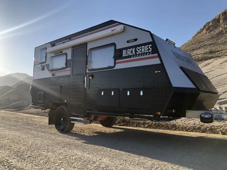 The Black Series has both an outdoor, slide-out, kitchen AND an indoor kitchen making cooking convenient and enjoyable.SuspensionBlack Series has worked tirelessly to develop the most robust independent suspension system available. The custom designed and engineered trailing arms allow each wheel to move independently, allowing for a smoother, more stable ride whether on the highway or on rough terrain. The quad shock design spreads the load across four shocks instead of two, allowing for a smoother ride, safer handling, and longer shock life.ExteriorThe HQ15 features our same rugged design language, while emitting a sense of luxury. The patented cone nose design allows for clean aerodynamics for easier towing. The diamond plate lower section and corner bash bars help keep its beauty when things turn rough. The custom designed and engineered independent suspension design is used to keep a smoother, more stable ride for safer towing. The roof mounted solar panels help keep the two 100ah batteries charged up so the trailer is ready to go whenever you are. Tough, all-terrain tires are included with two full size spares.InteriorThe interior of our HQ15 is comfort, luxury, and contemporary design all in one. A queen size bed and convertible dining table to bed feature allows extra space for an additional adventurer. The cabinetry is modern and finished off with a high gloss timber veneer. The HQ15 contains a full bathroom with a slider door separator so you can truly experience comfort and privacy in a compact space. This unit includes a cassette toilet making dumping waste easy without the need to find an RV dump station.