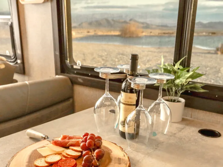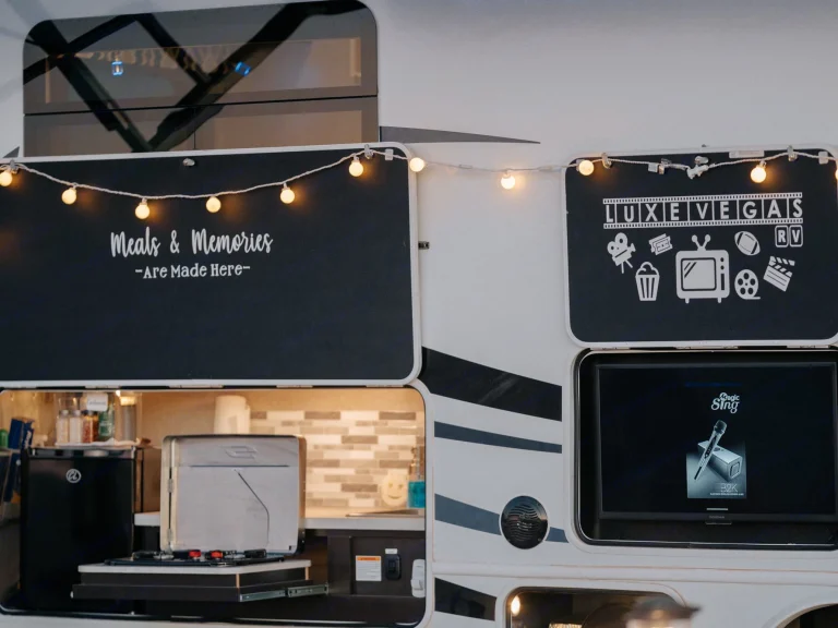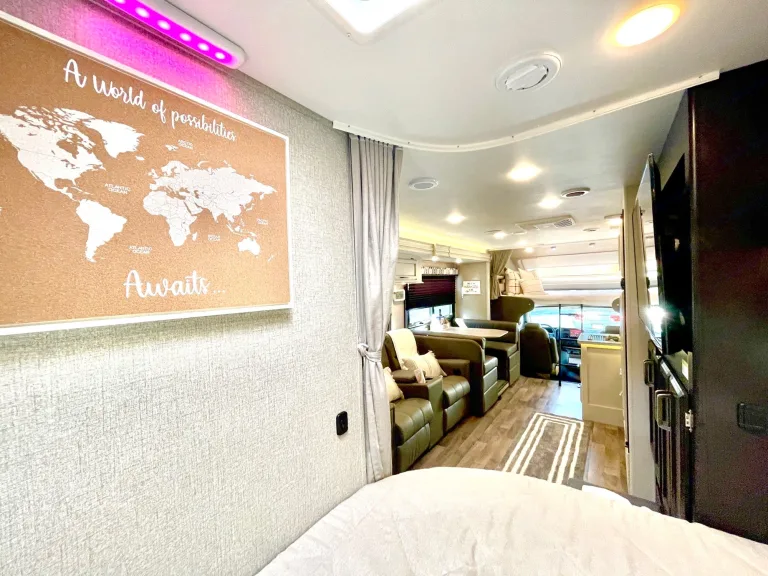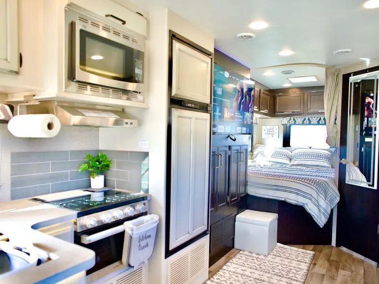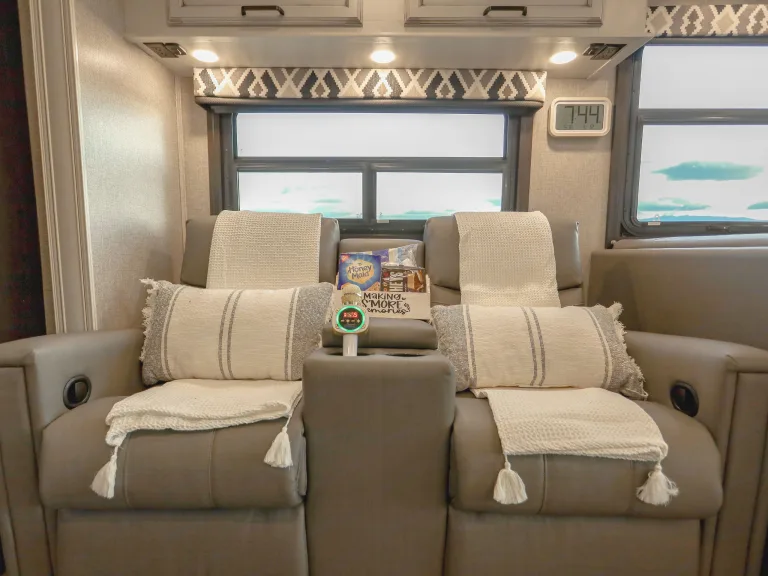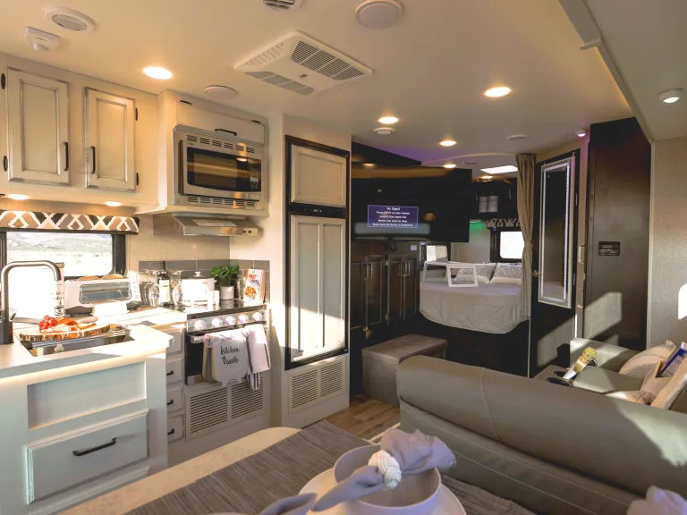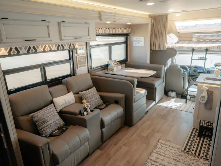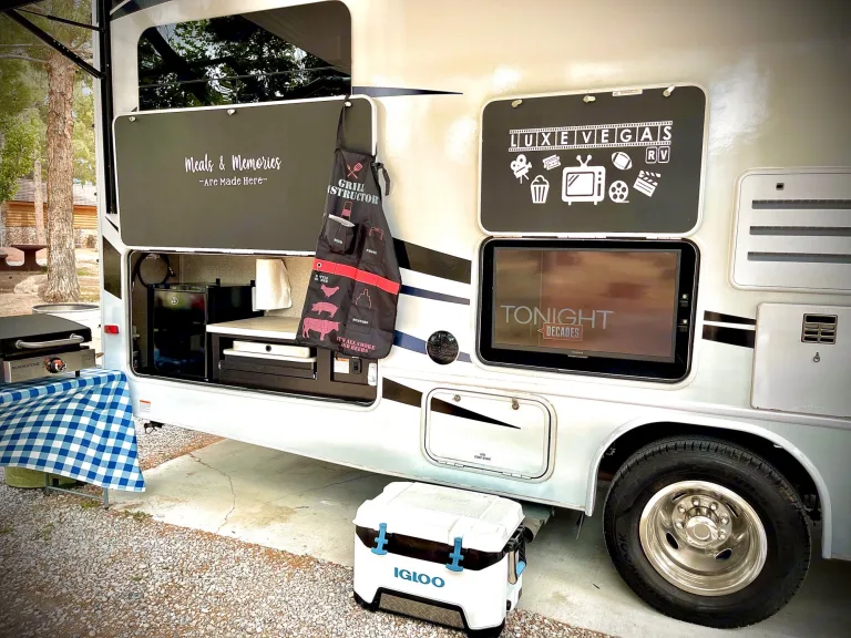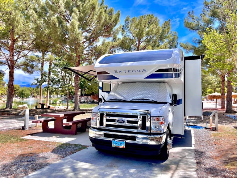 Our Instagrammable “@LuxeVegasRv” is unlike anything you've been in before, from the moment you walk in, it feels like a luxurious hotel suite. Our goal is to deliver a personalized touch to make your experience a once-in-a-lifetime, stress-free journey as you create memorable memories. We have crafted the details of all amenities that we have to offer.This Entegra Odyssey 25R has a Ford E450 engine that takes regular gas and drives like a truck. No special skills or license required! Trust me it is so easy to drive... You will feel comfortable behind the wheel right away, you can fill up and park pretty much anywhere you need, which is key to reducing stress on vacation.Our RV is equipped with top-of-the-line amenities and can accommodate up to 6 people. Enjoy the stunning views from the panoramic window located above the cab, which includes a queen bed. Don't forget to take in the majestic sunrise and sunset, and don't miss the opportunity to stargaze at night. Our RV also offers a cozy corner queen bed, a legless dream dinette that converts into a bed, and a spacious full bathroom. Relax in the reclining theatre seats while watching your favorite shows on the 50 inch LED TV. Plus, with a single slide out design, the living space dramatically expands when parked, providing plenty of room for the whole family. The RV also features a residential kitchen with a convection microwave oven and refrigerator. But that's not all, we also have an outdoor kitchen with a sink, stove, and mini-fridge, as well as an outdoor TV with surround sound speakers both inside and out.Also, rear backup cameras, turn-signal side activated cameras, and Bluetooth through the front console for music, phone, and navigation that connects right to your phone, so you can sit back, just enjoy your journey, and create a memorable glamping experience!What's includedWe Keep our RV fully loaded with pretty much everything that you need on a trip for a stress-free glamping experience,(Check our photo gallery for more info!)KITCHEN: