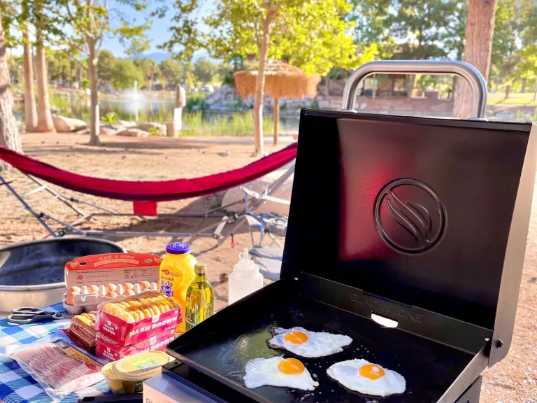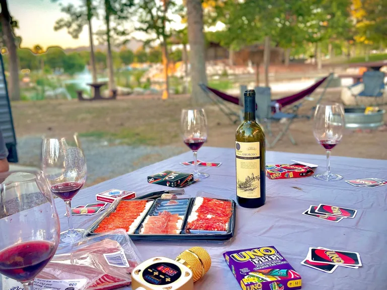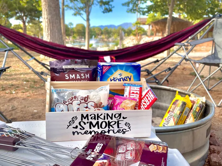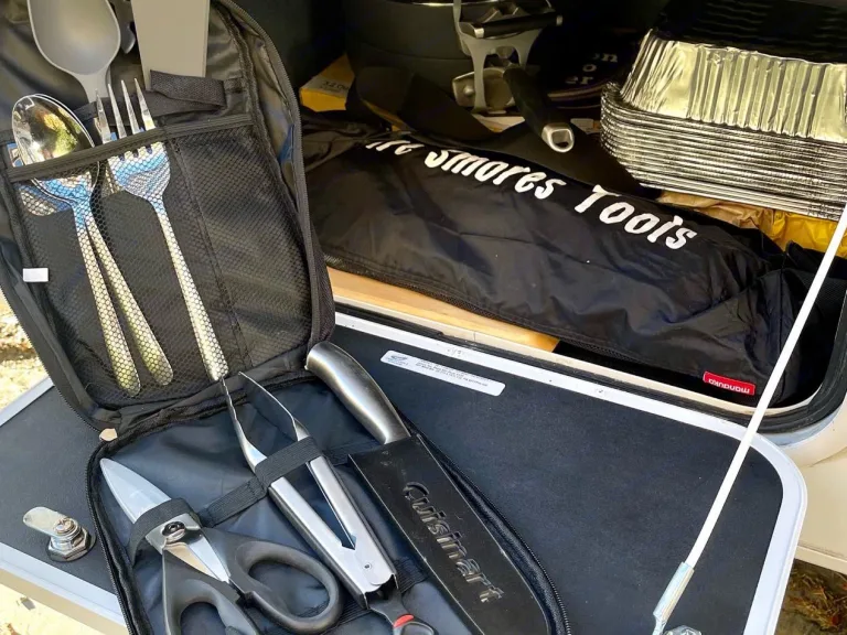 Basic camping Chairs, Foldable Table, Camping Lamp, Hammock, Cooler, Pop-up trash, Outdoor Rug, Door Matt, S'mores kit, and BBQ tools set, table coverEntertainment: