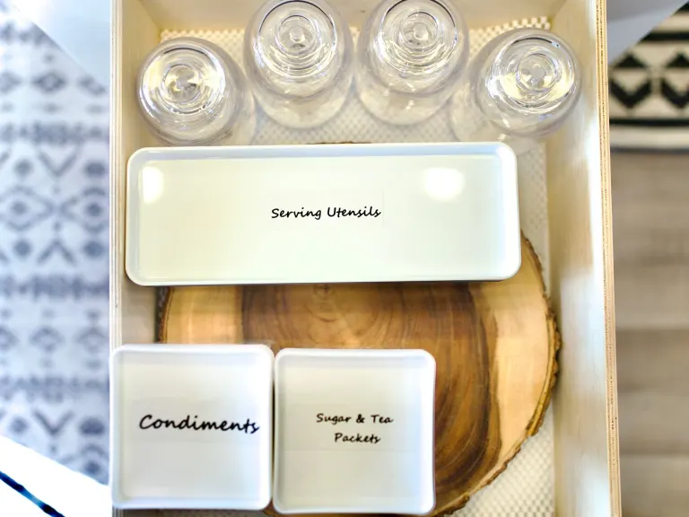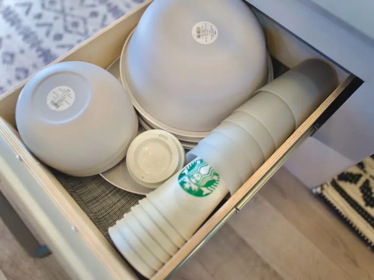 Mini Rice Cooker, choice of Keurig or coffee maker, Mini toaster, BPA Free Plastic Dinnerware ,Wine glasses, Silverware Utensils, Pot and pans with Lid, Kitchen utensil set, Knife, Scissor, Can/Wine/Bottle Opener, Lighter, tong, Peeler, Place Cutting Board,Collapsible strainer, Plastic Pitcher, Kitchen towel. cleaning supplies.BED & BATH: