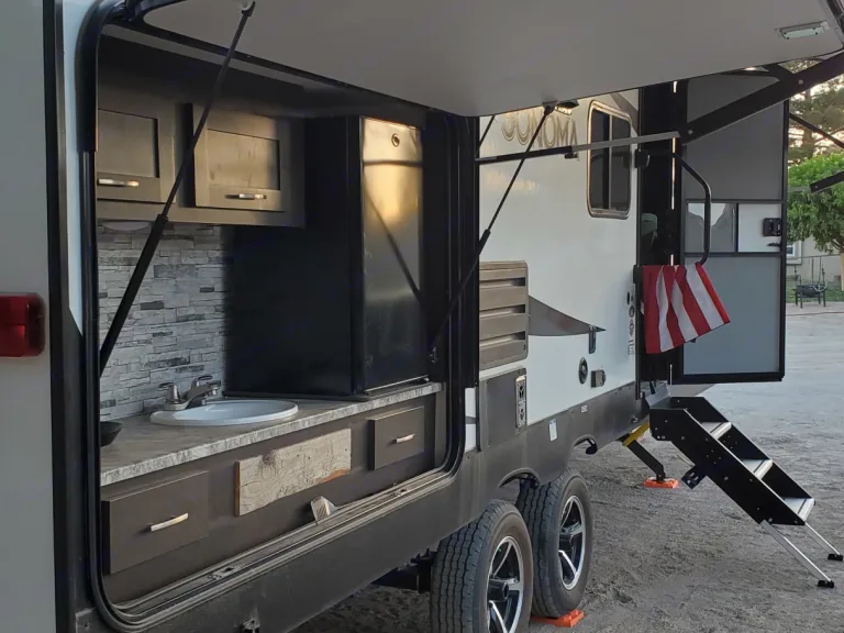 2021 forest river sonoma. Solar. A/C. Full kitchen, convertible u shaped dinette, one tip out, outdoor kitchen. Bumper mount gas grill. Sleeps 4 adults comfortably.