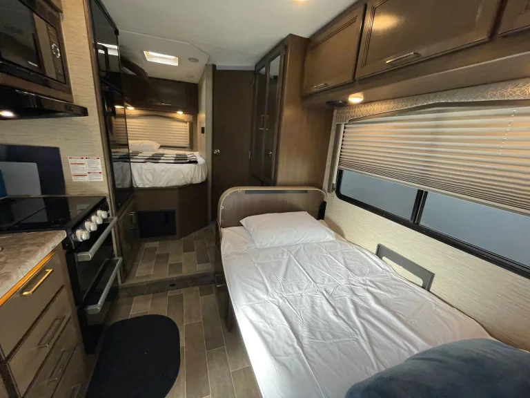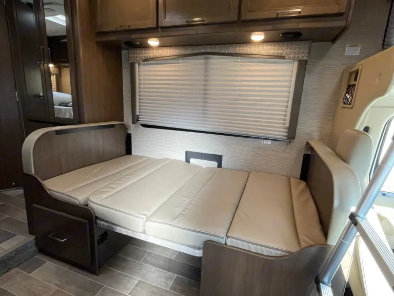 Unlock endless possibilities, as you create some tasty meals in your own personal kitchen, you'll find a recessed full-range three-burner gas cooktop, and microwave oven. The 12-volt refrigerator and freezer run off propane and electricity and has an automatic switchover. Stainless steel sink with sink cover and a pull-down sprayer with a flip-up countertop extension for extra counter space.Beds