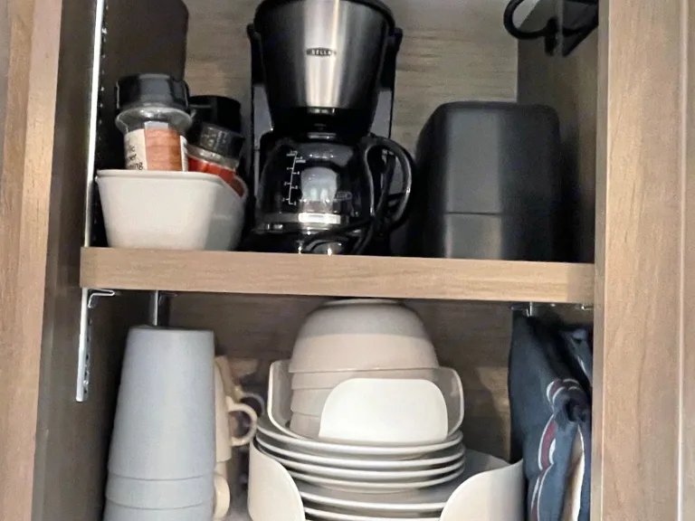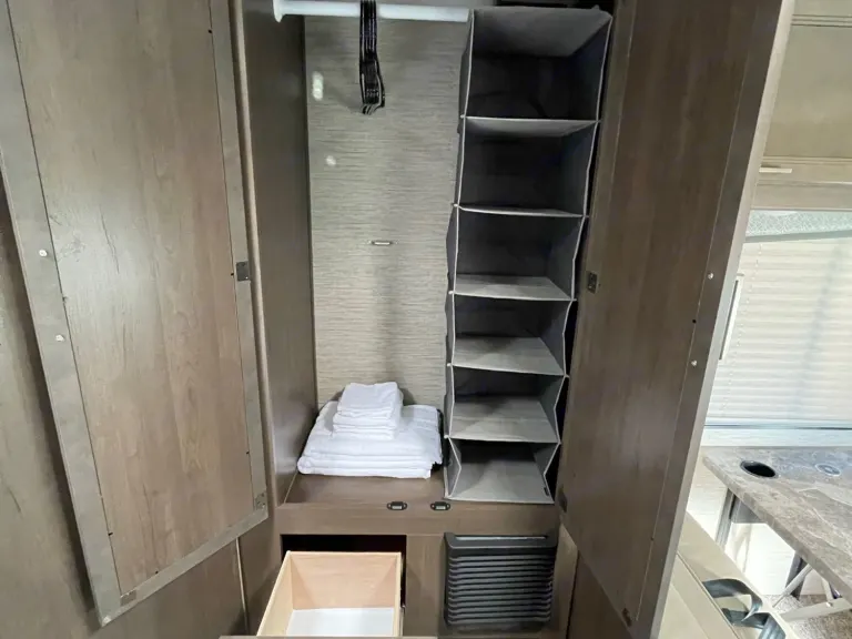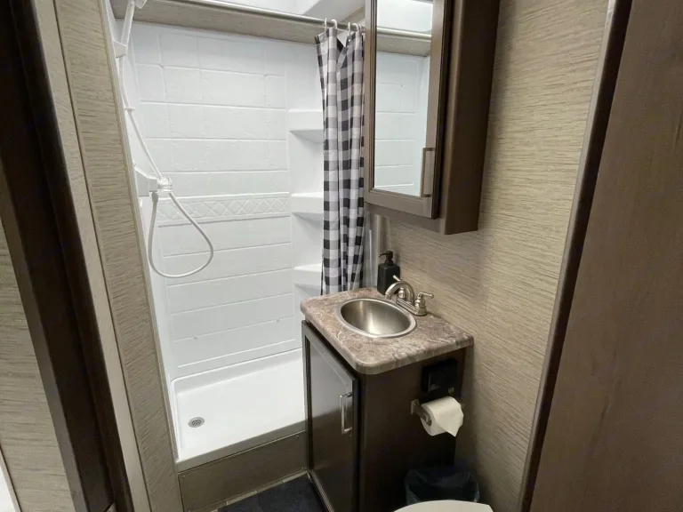 Your home away from home, sleeps 5 adults comfortably, two adults in the queen bed, two in the over-cab bunk, and one in the 48” x 68” convertible dinette bed. A queen bed (54” x 80” ), with a memory foam topper for added comfort. The upper cab bunk can sleep two adults (54” x 96”) and has a USB charging station with a net for easy access at night, cupholders, a privacy curtain, and a removable ladder. Mirrored storage closet with drawer below and a hanging rack to hang your clothes, hangers included.Bath
