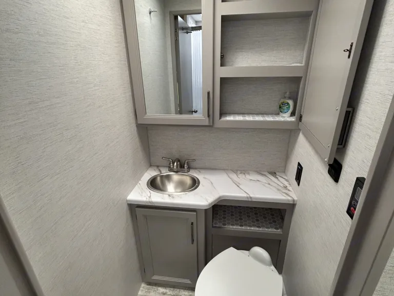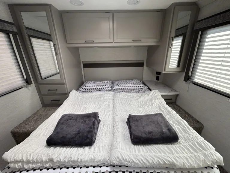 Another great advantage: The floorplan does not have any slide-outs. It is always spacious, and not only when the slide is extended. Plus NO issues on the road with a slide that might or might not work properly!The sleeping area can easily be separated with a door and offers a lot of easily accessible storage space and a comfortable Queen Bed, which is completely by passable. Since we always want to offer our customers something more, we equipped each of our motorhomes with a higher quality mattress, so you can sleep comfortably, even on vacation!The bathroom is divided into two parts, but can be connected with the opening and snapping the doors together to an "En-suite" bathroom: This offers a shower cubicle with solid doors and a spacious bathroom, by 5 people can easily stow their utensils!
