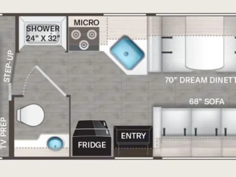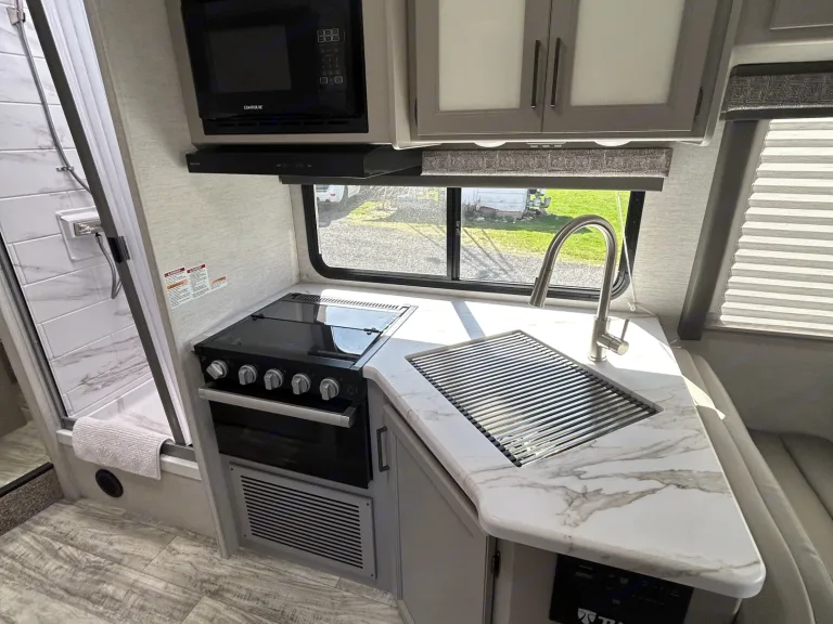 This new unit comes with the tankless water heater, which not only conserves water, you will also receive hot water right away, without waiting until the watertank is heated up.The corner kitchen with the high-quality stainless steel sink and the large work surface offers enough space to comfortably prepare a delicious dinner. It has a large fridge with separate freezer, includes a three-burner gas hob and a convection microwave.