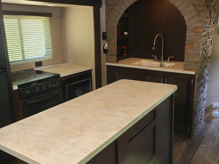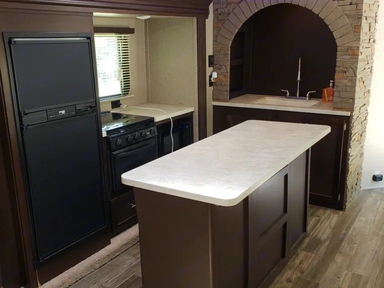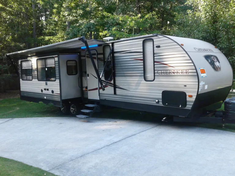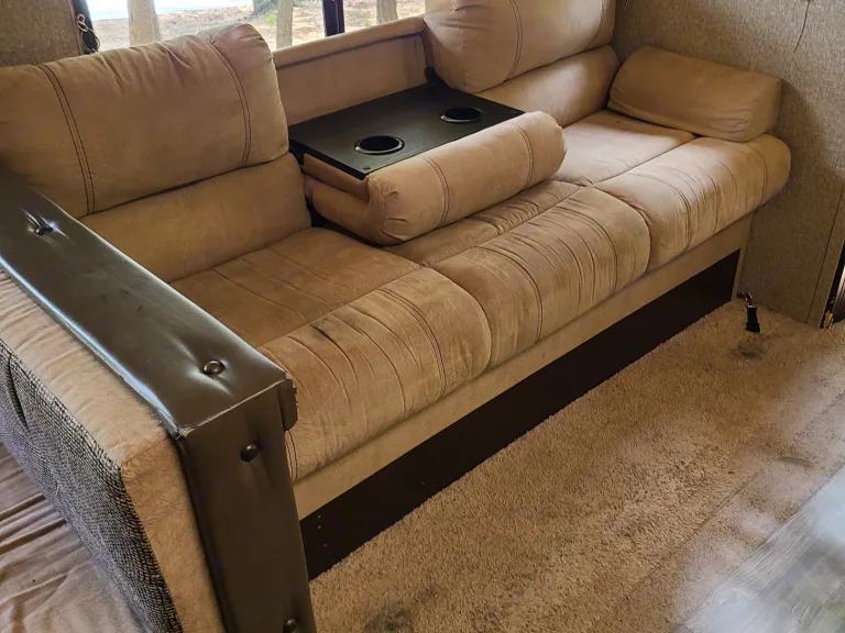 Pet friendly camper with unique camp side living room and dining room slide out with all windows. Completely stocked with all kitchen items and linens. DVD and bluetooth stereo. Inside and/or outside speakers.