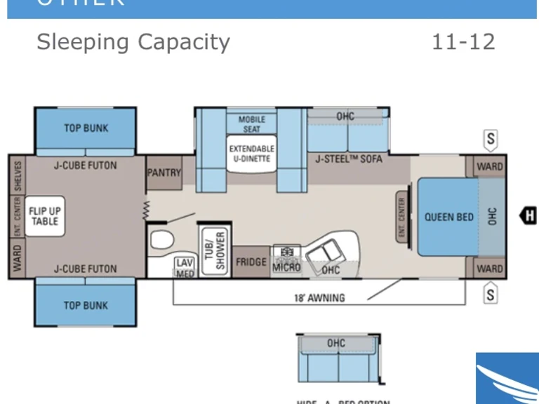 This is a great Bunkhouse model. Sleeps 12!!! Large queen bedroom up front, kitchen dining slide out, and He back room has 2 slide outs with bunk beds on eqxh side, the bottom bunks fold out to queen beds!