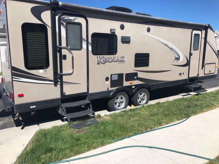 Nice camper with Huge slide-out that makes it feel like a real home away from home. Ice cold Air conditioning. Hot shower. Watch Movies, Cook food. Big comfy recliners, couch, and dining table. Huge awning offers tons of shade. Listen to music outside via outdoor speakers. The opportunities are endless. Book it today!****Includes Equalizer Hitch ******** Your Vehicle Must Have a Trailer Brake Controller*****Visit Arches, Zion, Bryce, Canyonlands, Capitol Reef, Goblin Valley, Moab, and much more in the Modern Style Kodiak Camp trailer.What's includedV8 Towable. Half ton towable.Comes with RV toilet paper, pots, pans, cooking utensils, Coffee Pot, and SMORES KIT!!!!!! Bedding and towels.RecommendationsWe recommend going to All of the National Parks in Utah, or wherever you heart desires. We also recommend bringing sheets, pillows, bedding, towels, soap.Other things to noteNo smoking inside, No trash in the toilet. Only use the RV toilet paper as the septic system is delicate. Please do not take the RV on crazy dirt roads that may cause damage. Any other questions please feel free to contact me anytime.