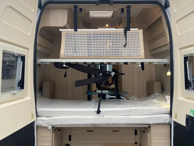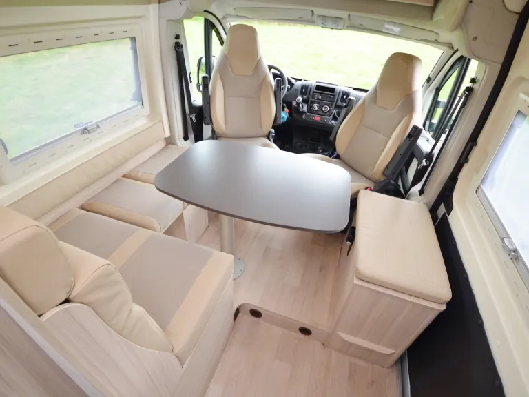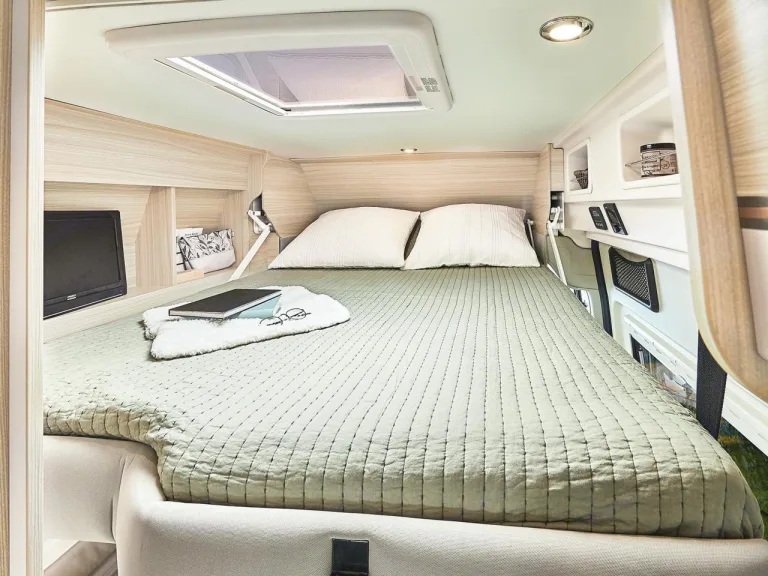 Ce fourgon aménagé, petit camping-car, est idéal pour les couples qui recherchent un maximum de confort, ou les familles : en version 5 places (6,38m de long, 3m de haut) avec 2 couchages superposés à l'arrière, un lit double en pavillon, et un lit supplémentaire à l'avant