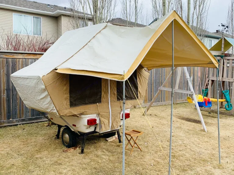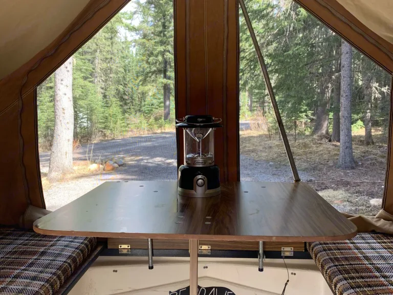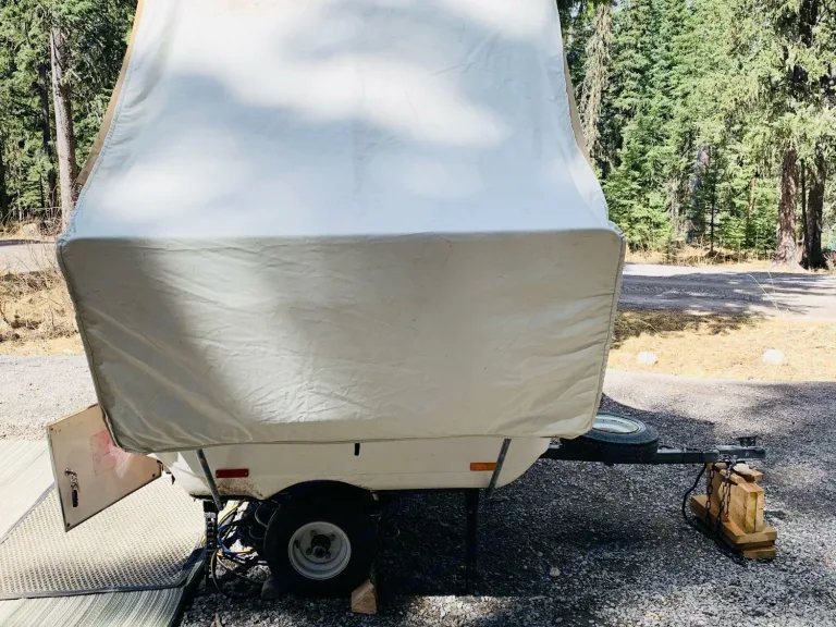 Super Cool Vintage 1983 TravLite that sleeps 2 adults plus a child comfortably with bed extension. A perfect for a weekend getaway and we call it our Harry Potter Tent! It is motorcycle towable but also works behind a small SUV or a Sedan car, easy towing. Easy set up and dismantle so you can have fun as soon as you arrive. Even if you're new to tent trailering, can be setup in less than 15 min. Travel easily with this light weight trailer that is easy to tow and maneuver. The only motorcycle/small vehicle camping trailer that gives you a roomy tent camper feel with storage capacity of a utility trailer. Canvas is in perfect shape, no tears or leaks!What's includedThe beds folds into a dinette table. Over 20 cu. ft. of storage. Full 6’6” standing head room. Total trailer weight- 310 lbs. Canvas Awning with ropes and pegs. Included is a small camping table, stepping stool, milk crates for gear, portable DVD player and remote. Kitchen Kit, tarps/ropes, 26 litre water jug, small table, two chairs, cleaning supplies, hot dog stick, Newspaper and lighter. Battery operated lights, playing cards and uno game, No pets*. No Smoking. Not for off road. Can sleep 2 adults plus a small child. 4 pin flat wiring connector is required.RecommendationsBring your own bedding and DVD’s for the portable DVD player.$100.00 fee will be added if it is not returned clean.Other things to noteNo pets*. No Smoking. Not for off road.Type of RV: Micro Trailer