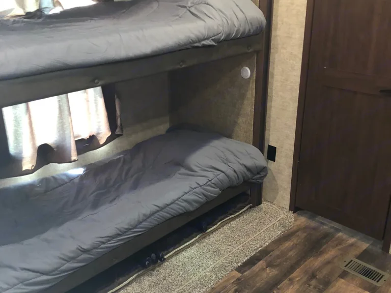 This Sierra has 2 bedrooms and 2 full bathrooms in 5 slides. Queen up front and triple bunks in the back with a full size refrigerator, pull out sofa, fireplace and an outdoor kitchen as well. Fully stocked with all the comforts of home including all linens(sheets,towels,etc.) cookware, pots & pans, griddle, grill, Keurig, outdoor rug, tables and chairs. Directv available also.