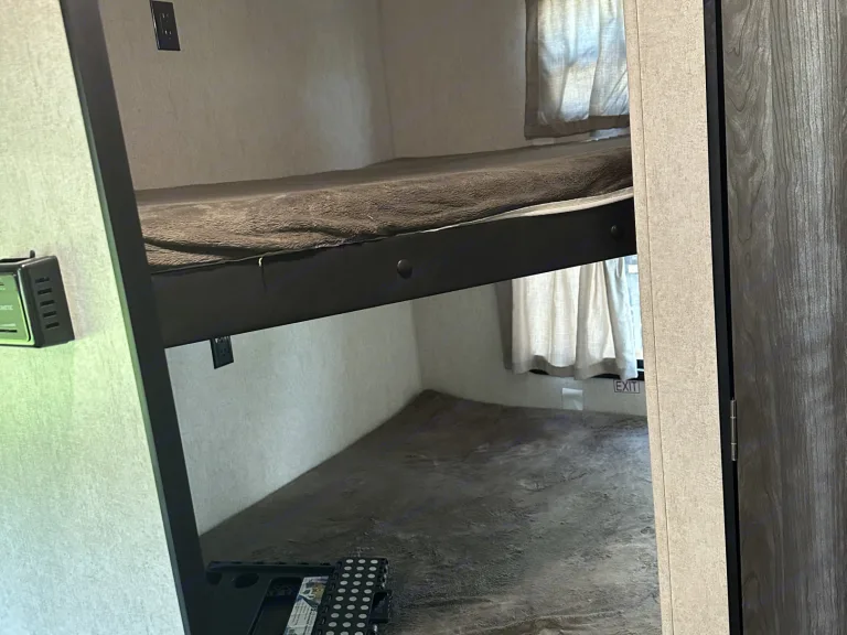 This camper has full sized bunk beds, queen hide-a-way bed and the table can make into a bed. So many sleeping options! Bedding will be included.