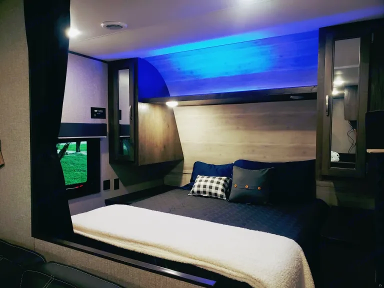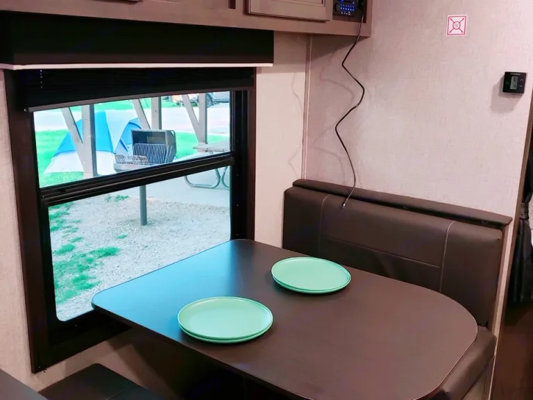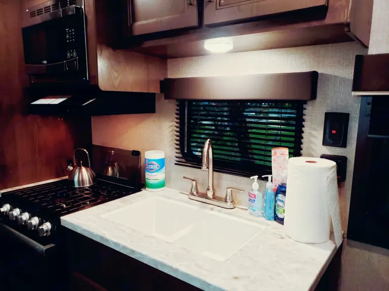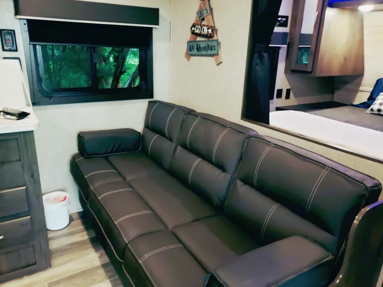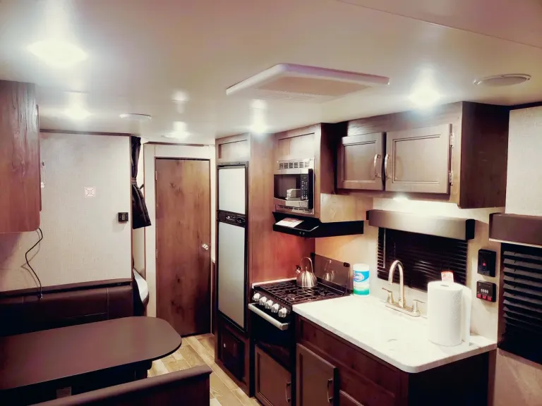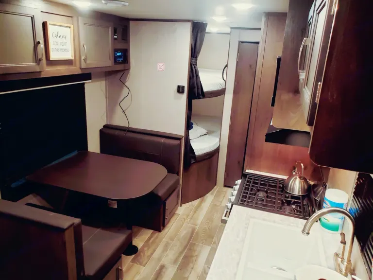 This is a newer travel trailer so all looks and works great. Inside is a full kitchen, refrigerator, couch, dining table (that folds into a bed), 2 bunk beds & the master bedroom that has the storage you need. Another great feature is if you like to enjoy the outside, this trailer comes with an awning where you can relax, listen to some music and enjoy a nice drink. We can't wait to serve you and your family :) What's includedFirst and foremost, we take cleanliness very important, who wants to be somewhere they can tell others stayed before? Not us. We make sure to have consistent clean sheets/blankets, sanitized surfaces and make it our goal it that you feel in a fresh environment. Also included are games, 4 camping chairs, toiletries, hand soap & cooking utensils. No extra charge for these additions as well.RecommendationsWe really love taking our rig to Lake campgrounds; full electricity, water and you can go swimming, fishing or just relax. At the campsites you can BBQ, have a fire or just relax under the awning with some music and drinks.