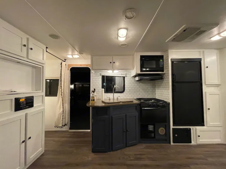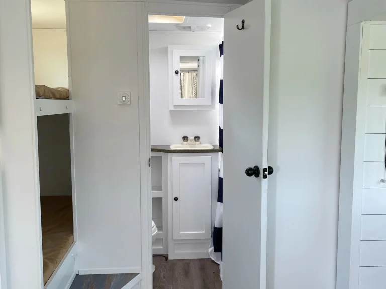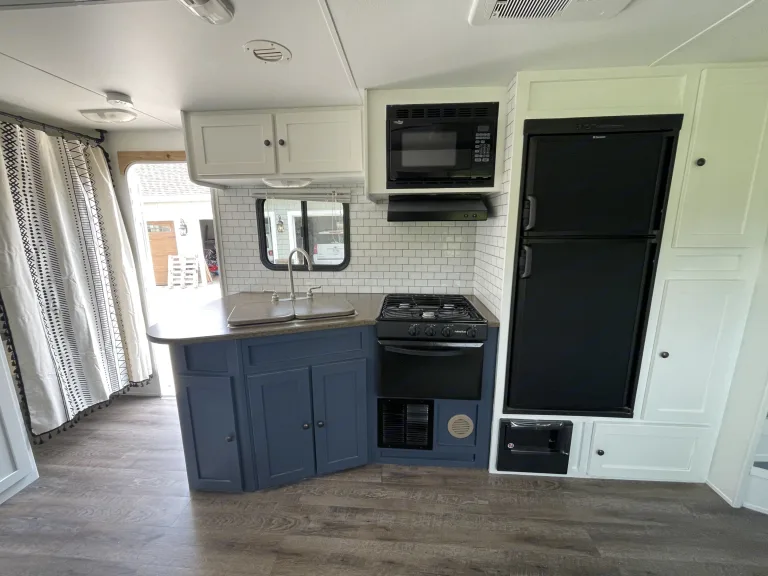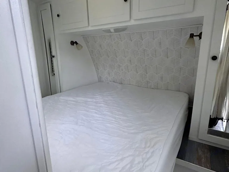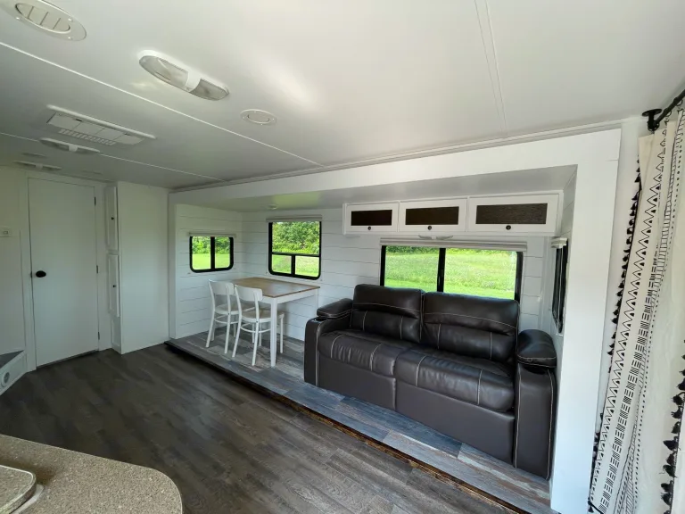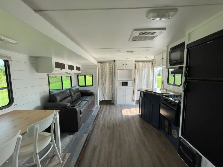 Featuring a queen-sized bed, 2 bunks, sleeper sofa, swivel TV, kitchen sink, gas stove/oven, microwave, fridge, ventilation, AC/heater, shower, toilet, vanity, water/sewer hook ups, power awning, power slide out, indoor/outdoor speakers and stereo. Tons of storage space underneath for all of your adventure gear! Sleeps 5-6 comfortably, could add full size blow up mattress in main area for additional sleeping.What's included2x camp chairs, camping table, outdoor rug, cookware, utensils.