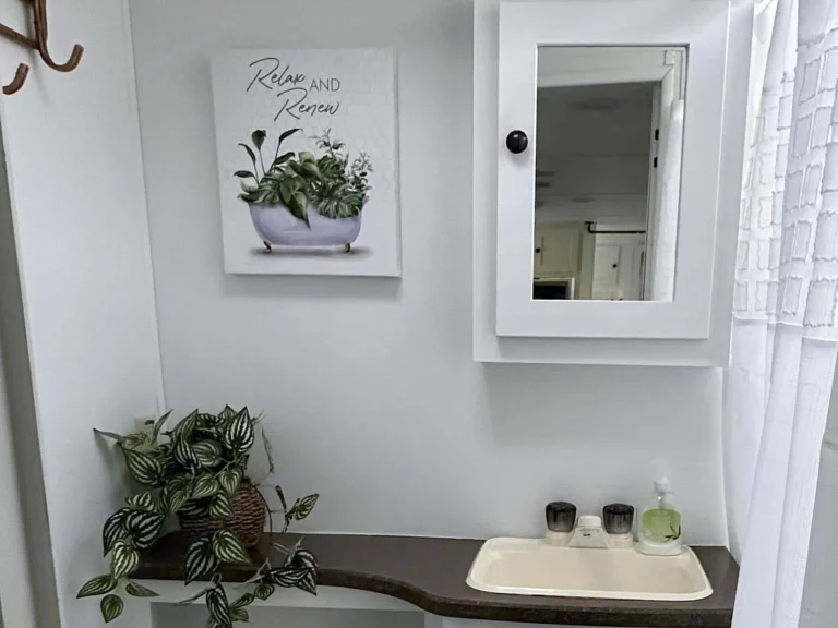 Beautifully renovated with modern Boho charm: faux shiplap, boho curtains, new flooring throughout, and faux subway tile backsplash throughout kitchenette.