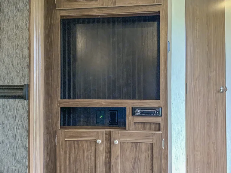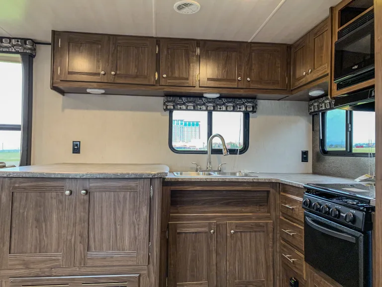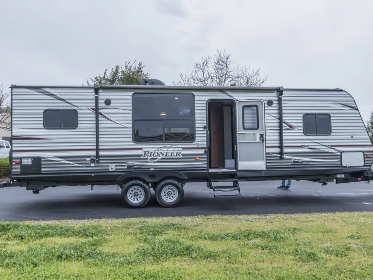 33.5 foot Pioneer Travel Trailer Rear Kitchen model with a TON of kitchen pantry space for all those delicious meals to be cooked for your whole family while camping.:) 32 inch flat screen tv, stereo, microwave, fridge, oven, splatter proof glass top over top of the stove to keep things clean on your trip.