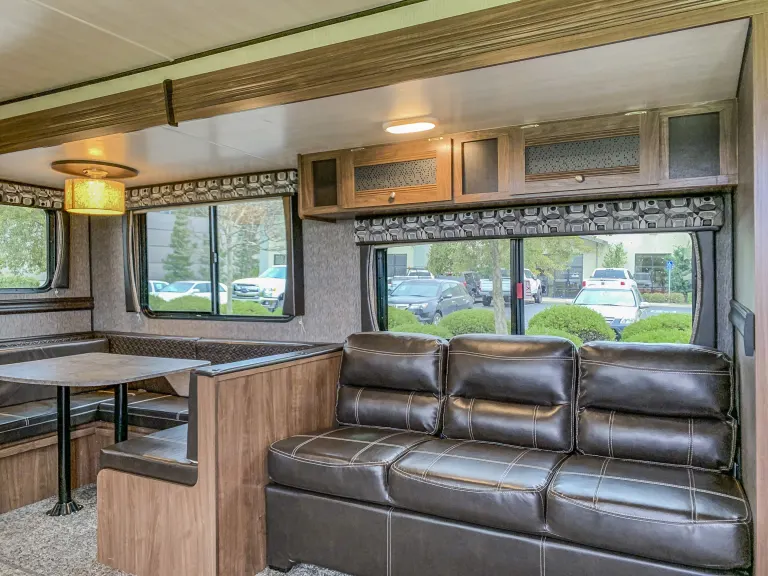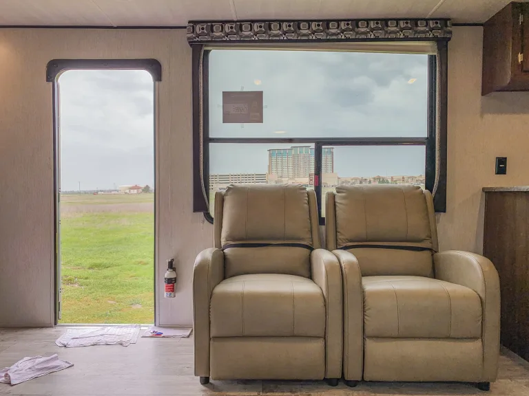 2 super cushy recliners, sleeps 6-8, indoor and outdoor shower, outdoor speakers and led lights.living room slide out, trailer rack to load up bikes, kayaks to take on your next camping adventure!memory foam mattress topper for extra cushion on the bed (rv beds are horribly hard and uncomfortable)This is a great trailer ready to be go out and have fun in!