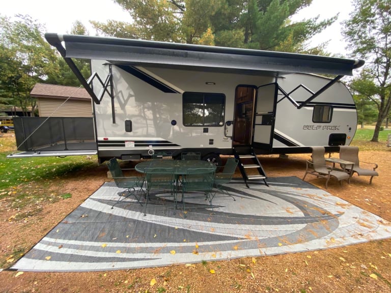 Our 2019 Wolf Pack Toy Hauler Sleeps 6, is Dog Friendly & has all the amenities of home. The Private Queen master bedroom is located in the front of the camper and has a Memory foam mattress. In the back of the camper there is a table & bunkbed that both make into full beds & will each sleep 2 more adults. A great asset to this camper being a toy hauler is the deck. Even if you don’t haul your favorite motorized toy, the deck offers more room to sit & enjoy your morning coffee or watch the sunset. It even comes with a screen to keep those pesky mosquitos out. The camper includes TV, DVD player & Radio with outdoor speakers. All your basic necessities are provided with pots & pans, Keurig coffee machine to towels. The freshwater tank holds 100 Gals which provides plenty of water. Both the greywater and blackwater tanks hold 38 Gals each.