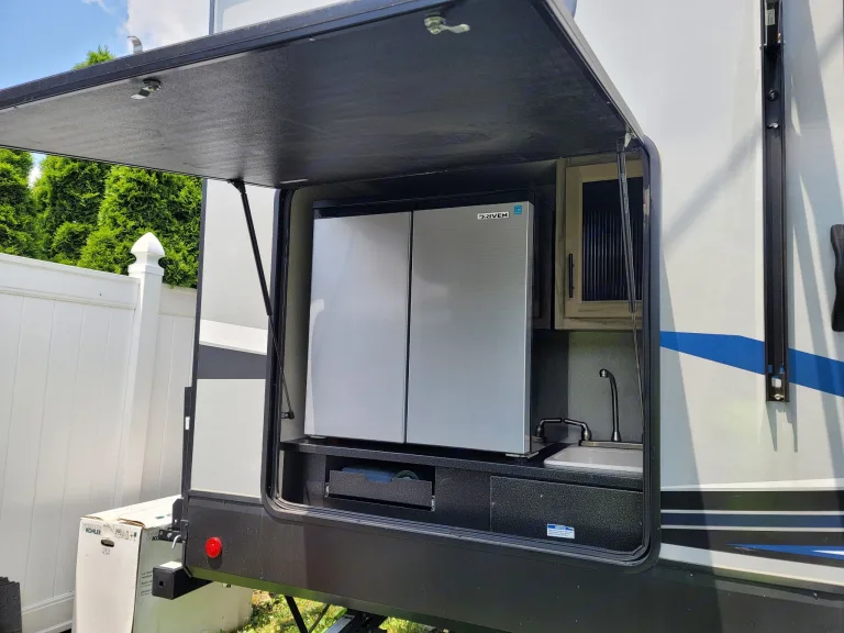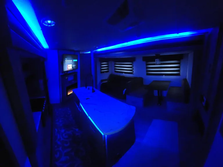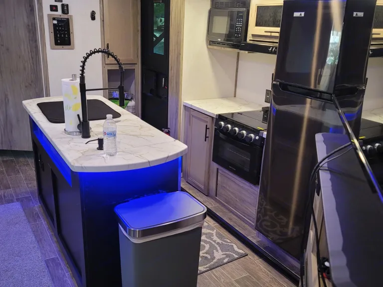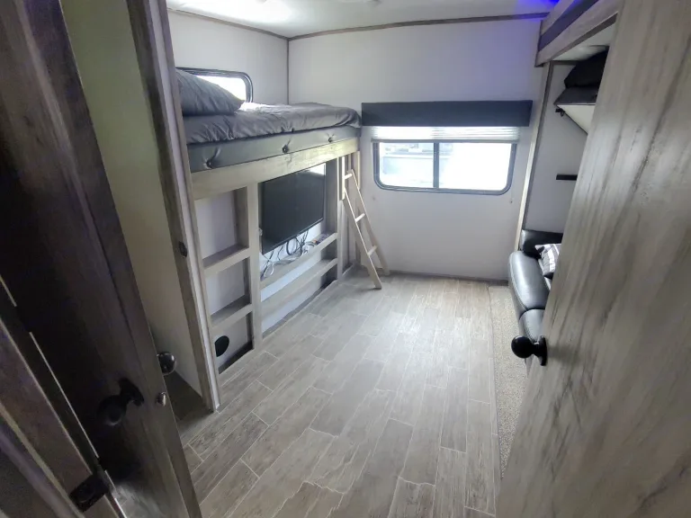 Camper is like new with 2 bedrooms, 1.5 bath, 2 Air conditioning units, fireplace, indoor and outdoor refrigerators, 2 TVs, 2 entrances, and outdoor kitchen.