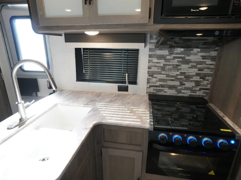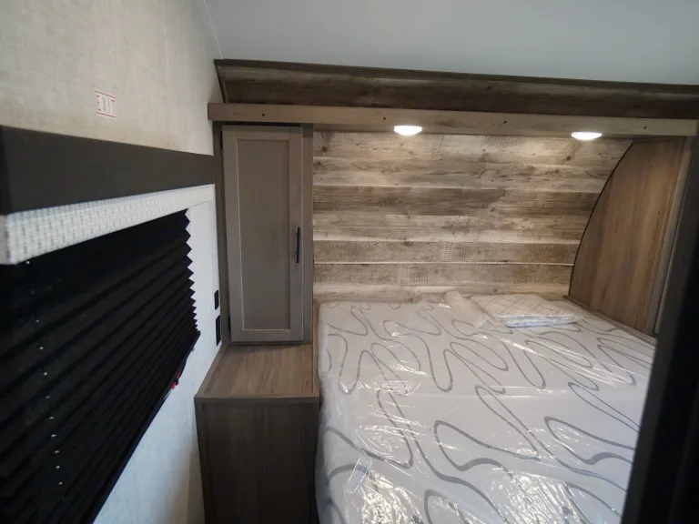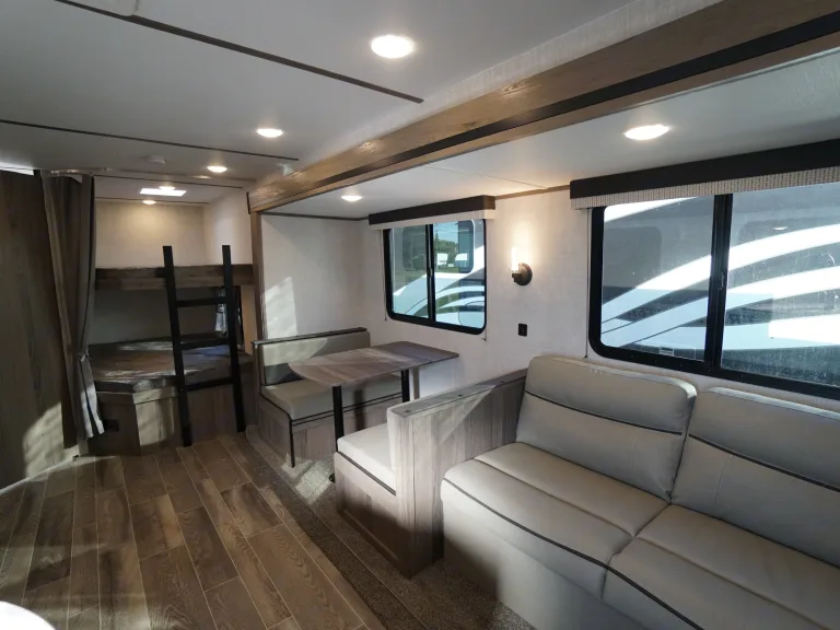 Great floorplan for the family! Double bunks, slideout and front queen bedroom. It has double entry as well so there is easy access to the bathroom even when the slide is in. Comes with full kitchen, and the dinette and sofa also convert to beds. Outside storage with large pass through front storage.