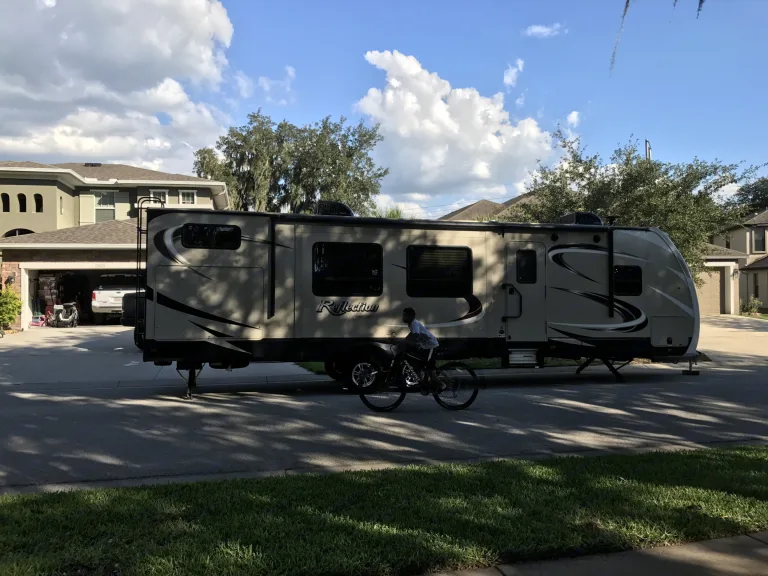 This Grand Design Reflection is 37' long with the main bedroom up front with a queen bed, overhead and side storage, a closet, and storage underneath the bed. There are 3 slides, two for the kitchen and living room, and one for the rear bunkhouse. There are two air conditioners and a 35,000 BTU heater with a 5,000 BTU fireplace.