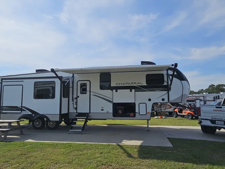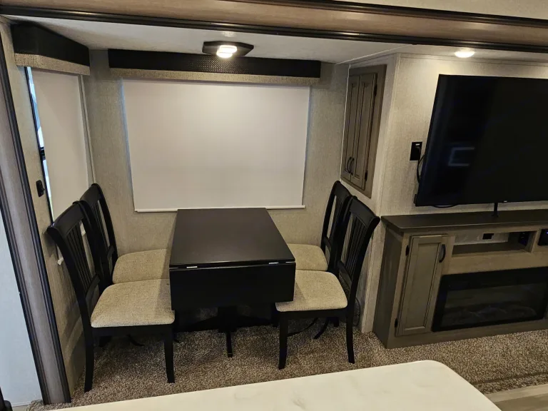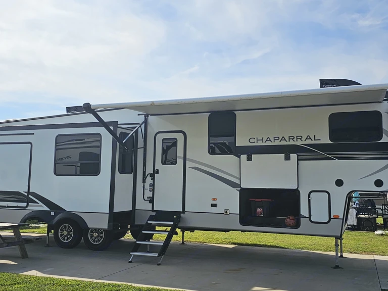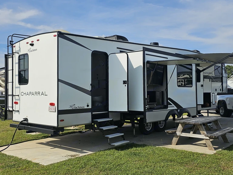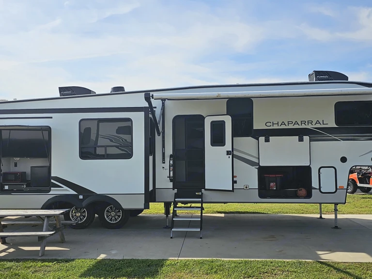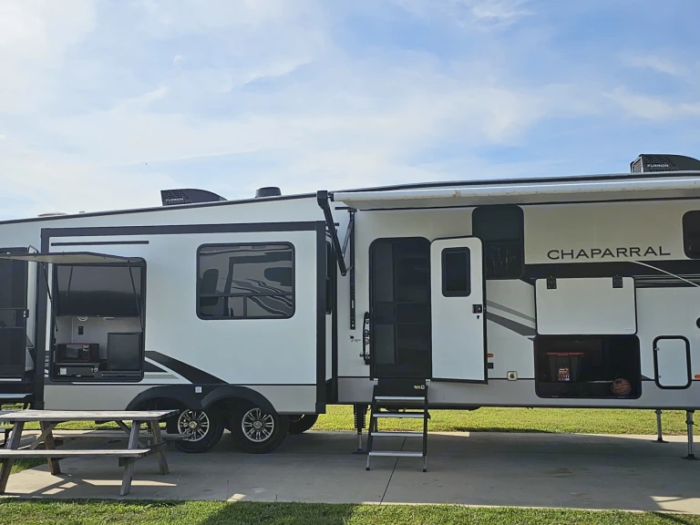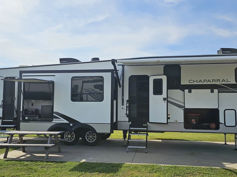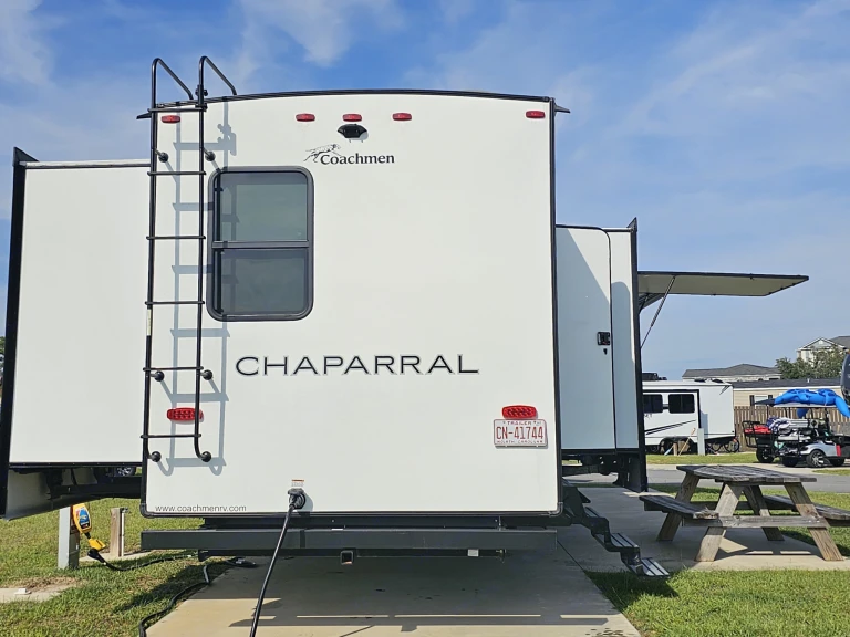 Welcome to the world of premium RV rentals with our stunning 2022 Coachmen Chaparral 373Mbrb. Whether you're planning a family vacation, a couples' getaway, or a road trip with friends, this meticulously designed fifth wheel offers the perfect blend of comfort, style, and functionality. Get ready to embark on an unforgettable adventure with all the conveniences of home on the road.**Exterior Features:**- **Quality Craftsmanship:** The Coachmen Chaparral is known for its exceptional build quality, ensuring a safe and reliable journey for you and your loved ones.- **Smooth Towing:** Featuring an aerodynamic front cap, this fifth wheel cuts through the wind for a seamless towing experience. Set up is a breeze with the electric front and rear stabilizer jacks.- **Outdoor Entertainment:** Take your relaxation outdoors with the exterior entertainment center, complete with a large LED TV and speakers. Perfect for enjoying a movie night under the stars or catching the game while tailgating.- **Storage Galore:** With spacious pass-through storage compartments and a rear garage, you'll have plenty of room for all your gear, bikes, and outdoor equipment.**Interior Features:**- **Spacious Living Area:** The living area is designed for relaxation, featuring comfortable seating, a cozy fireplace, and a large LED TV. It's the ideal spot to unwind after a day of adventure.- **Gourmet Kitchen:** The fully equipped kitchen boasts solid surface countertops, a residential refrigerator, a three-burner cooktop, and a generous pantry. Cooking on the road has never been this enjoyable.- **Private Master Suite:** The luxurious master bedroom includes a king-size bed, a wardrobe with washer/dryer prep, and an en-suite bathroom with a spacious shower and solid surface countertops.- **Bunkhouse:** A separate bunkhouse provides a private space for kids or guests, complete with its own bathroom and entertainment center.- **Comfortable Sleeping Arrangements:** In addition to the master bedroom and bunkhouse, the living area sofa converts into a bed, and the dinette offers additional sleeping space, accommodating up to 9 people.**Additional Features:**- **Four Slides:** This fifth wheel features four slide-outs, offering extra space and a roomy interior.- **Climate Control:** Stay comfortable year-round with the dual-zone air conditioning and heating system.- **High-End Finishes:** The Chaparral 373Mbrb is adorned with premium cabinetry, residential-style fixtures, and elegant lighting throughout.- **Smart Technology:** Stay connected with the built-in Bluetooth audio system, USB charging ports, and optional Wi-Fi capabilities.Experience the epitome of luxury and convenience with our 2022 Coachmen Chaparral 373Mbrb rental. It's your passport to unforgettable adventures and cherished memories on the road. Contact Mtrv Rentals today to reserve your dream getaway on wheels!