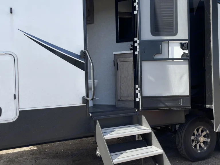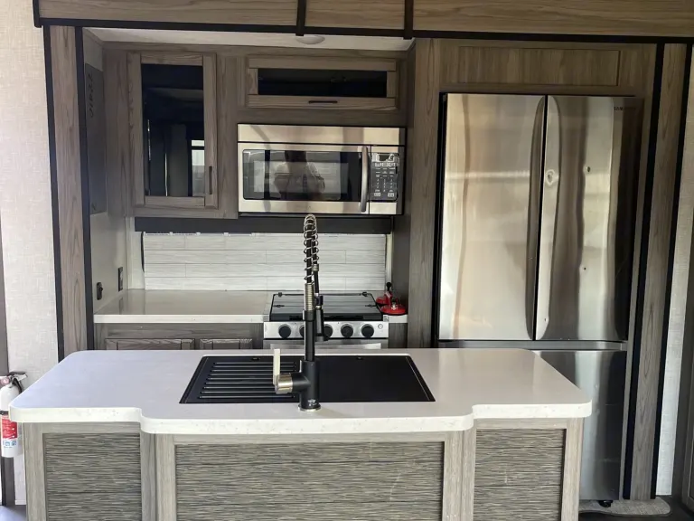 Introducing the 2022 Cameo CE4051BH, a luxurious fifth wheel RV that promises to elevate your camping experience to new heights. This stunning RV features a spacious and well-designed interior with all the amenities you need for a comfortable and relaxing vacation.Step inside the CE4051BH and be greeted by a beautiful and modern living space. The living room features a comfortable sofa and recliners where you can relax and watch your favorite movies or TV shows on the large flat-screen TV. The electric fireplace adds to the cozy ambiance, making it the perfect spot to unwind after a day of adventure.The fully-equipped kitchen features top-of-the-line stainless steel appliances, including a four-door refrigerator, a microwave, and a three-burner cooktop. The spacious island with a double sink provides plenty of space to prepare your meals, and the large pantry offers ample storage for your groceries and snacks.The CE4051BH features a private bunkhouse with two full-sized bunks and a separate entertainment center, making it the perfect space for kids or guests. The master suite is equally impressive, featuring a king-sized bed, a large closet, and a dresser with a TV. The en-suite bathroom boasts a residential-style shower, a vanity with a sink, and a porcelain toilet.Outside, you'll find a spacious awning where you can relax and enjoy the beautiful views.In summary, the 2022 Cameo CE4051BH is a stunning and luxurious fifth wheel RV that offers a spacious and well-designed interior with all the amenities you need for a comfortable and relaxing vacation. Book your rental today and experience the ultimate in RV luxury and comfort.