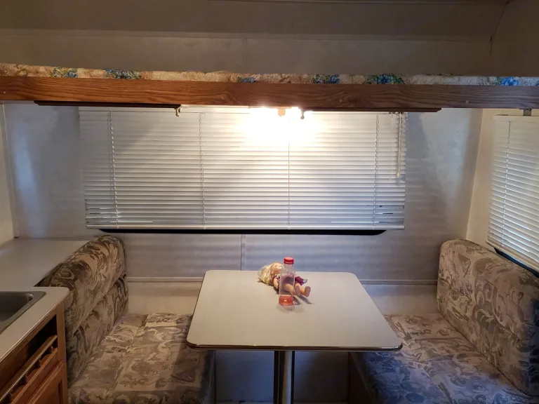 There is a restroom with a shower. It sleeps 5, two of those spaces are upper bunks better suited for children. 1 full size, 1 twin at the table location, 2 twin upper bunks. Dry weight for towing 3600 lbs.