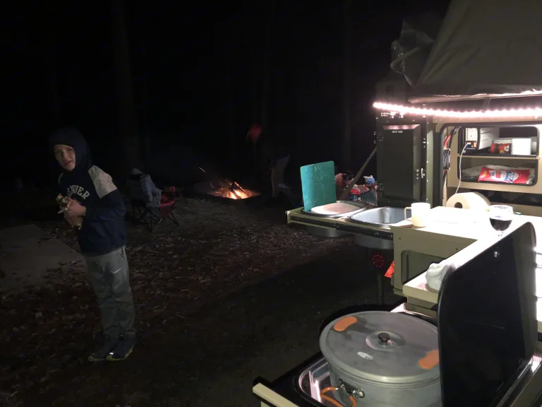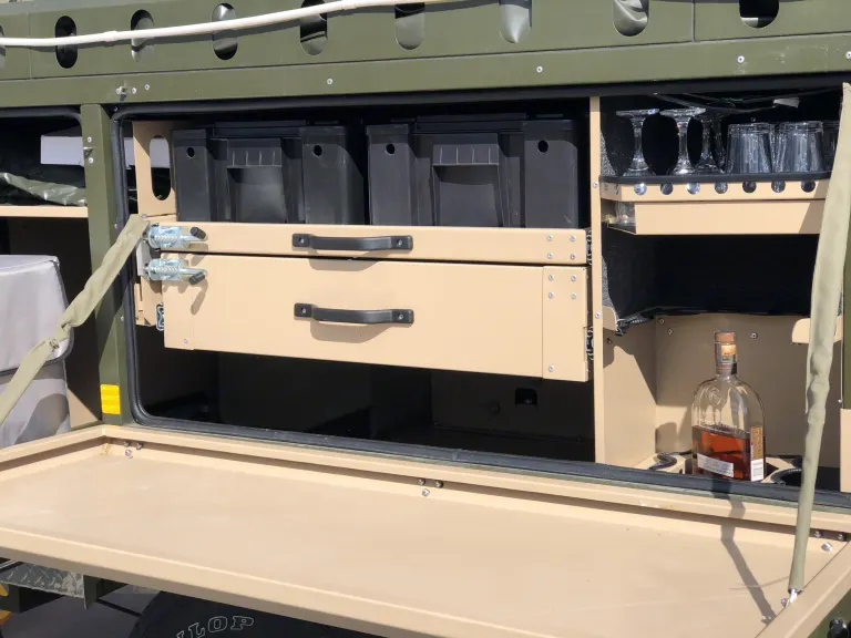 The UEV-390 isn’t just any off-road trailer, it’s the ultimate off-road camper and one of Conqueror’s best-selling trailers in the range. The Conqueror UEV-390 has more features and compartments than a treasure chest. From mini bar to full slide-out kitchen and even a dedicated spot to hang your clothes, the UEV-390 provides Conqueror’s signature comfort and luxuries. When erect, the tent reveals a king size bed (2.1m x 2.1m) up top and a large living area down below. The bed can comfortably accommodate two adults (and a child) while the enclosed living area will happily house an inflatable double bed or two single camping stretchers. The Conqueror UEV-390 sports numerous storage compartments but the real magic happens on the sides and at the rear of the trailer where an L-shaped kitchen slides out on a robust drawer system. Lastly, the Conqueror UEV-390 is built for the toughest conditions. Despite its rugged construction, the UEV-390 is surprisingly light (1875 lb tare) and well balanced. Even with water in the twin tanks, the tow hitch is easy to lift. Most importantly, the UEV-390 shakes off knocks, bumps and scrapes with ease and is the ultimate off-road escape machine best suited for those families and couples seeking adventure