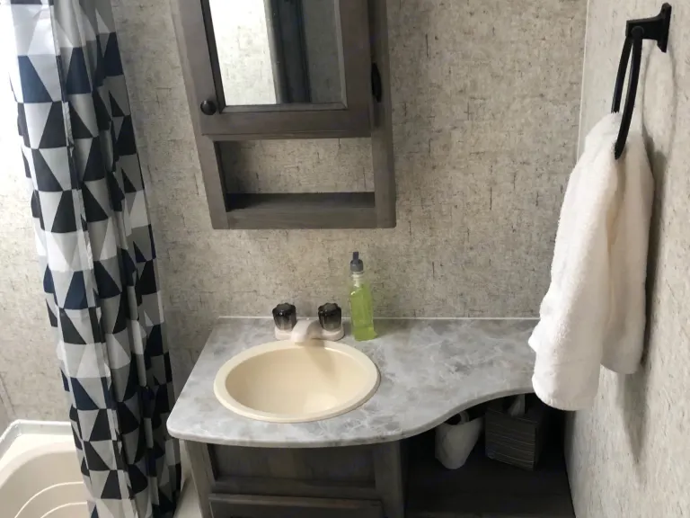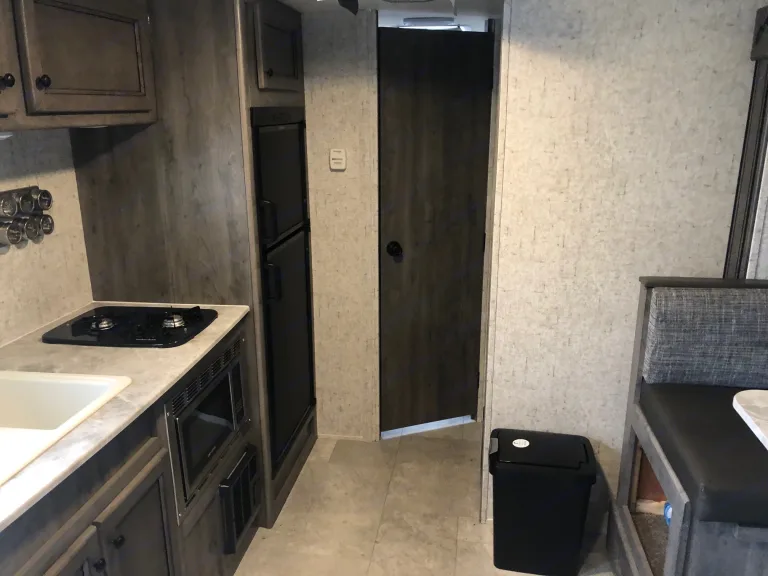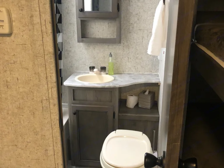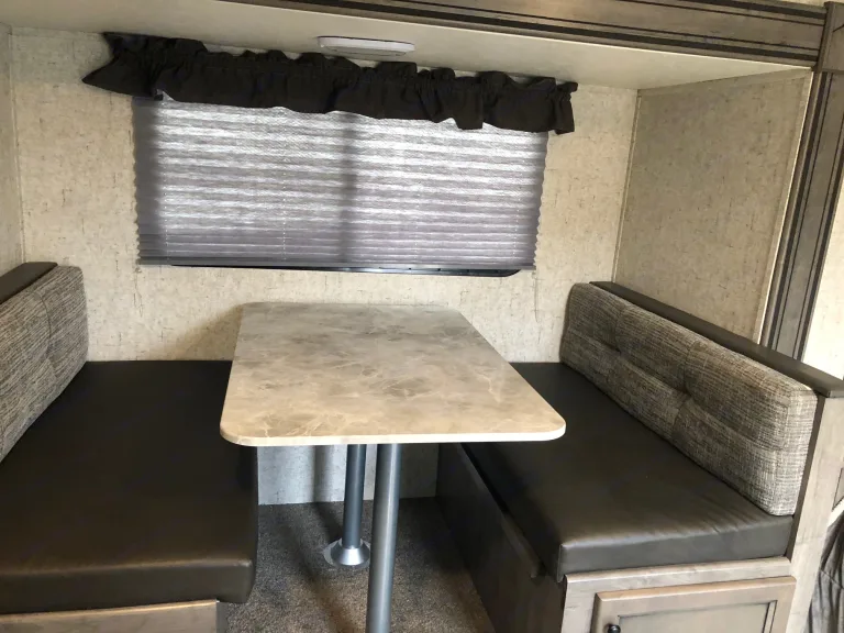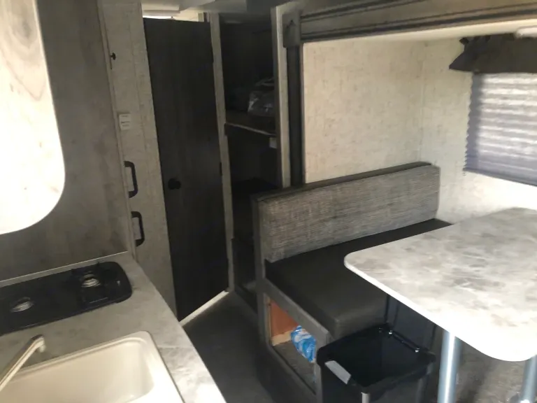 Have you dreamed of nights around a campfire, marshmallow in hand, and music in the background? Whether you prefer to be with family, friends, or just the dog, this camper is perfect. It isn't too large and fits easily into most campsites. When you’re catching a break from the outdoors, you’ll notice the interior is a sleek multitude of grays that is truly relaxing.With just enough room for the family (or friends) you can have everyone sleep in the same area. Two bunk beds near the rear perfectly fit kids or most adults. The queen-sized mattress (NOT a camper queen) comes with two pillows, bedding, and a comforter. The added pillow-top mattress will make your nights feel like home.Storage is ample in this tiny trailer. Not only will you find additional storage on the outer parts of the trailer, pull-through storage, you will have ample storage in the dining room benches, in the bathroom, and above the queen-sized bed.Whip up delicious meals on the inside stove OR give the provided outside gas-grill a go. Enjoy your delicious meal in the slide-out dining room which easily seats four. Even better, sit outside and enjoy the scenery while you listen to nature sing.So, why this trailer? Below is a list of provided items: