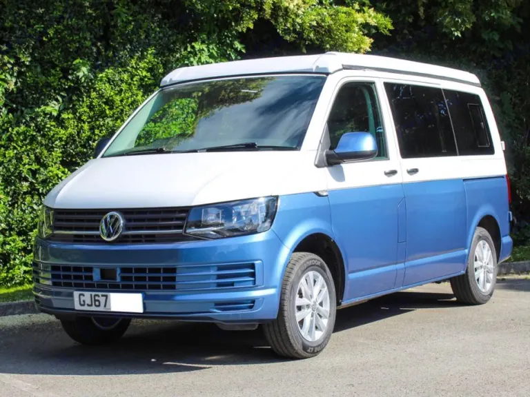 VW Crusader T6 Camper VAN White AND Blue ON A 67 Plate. Featuring A Leisuredrive Side Elevating Roof, A Fully Fitted Kitchen IN Silver Birch Wood Finish Including AN Electric Pumped Sink With Dual Burner HOB AND Glass Cover. AN Oven AND Grill. A Dometic 3 WAY 60L Fridge Freezer, Stow Away Dining Table. Rear 3 Point Seat Belted Seats Fold Down Flat TO Make UP A Large Double BED IN A Hard Wearing Blue Check Upholstery. Passenger Swivel Seat. Mains Electric, Twin Battery, 12V Electric . Fully Sheep Wool Insulated AND PLY Lined. 4 Berth With AN Additional Roof BED